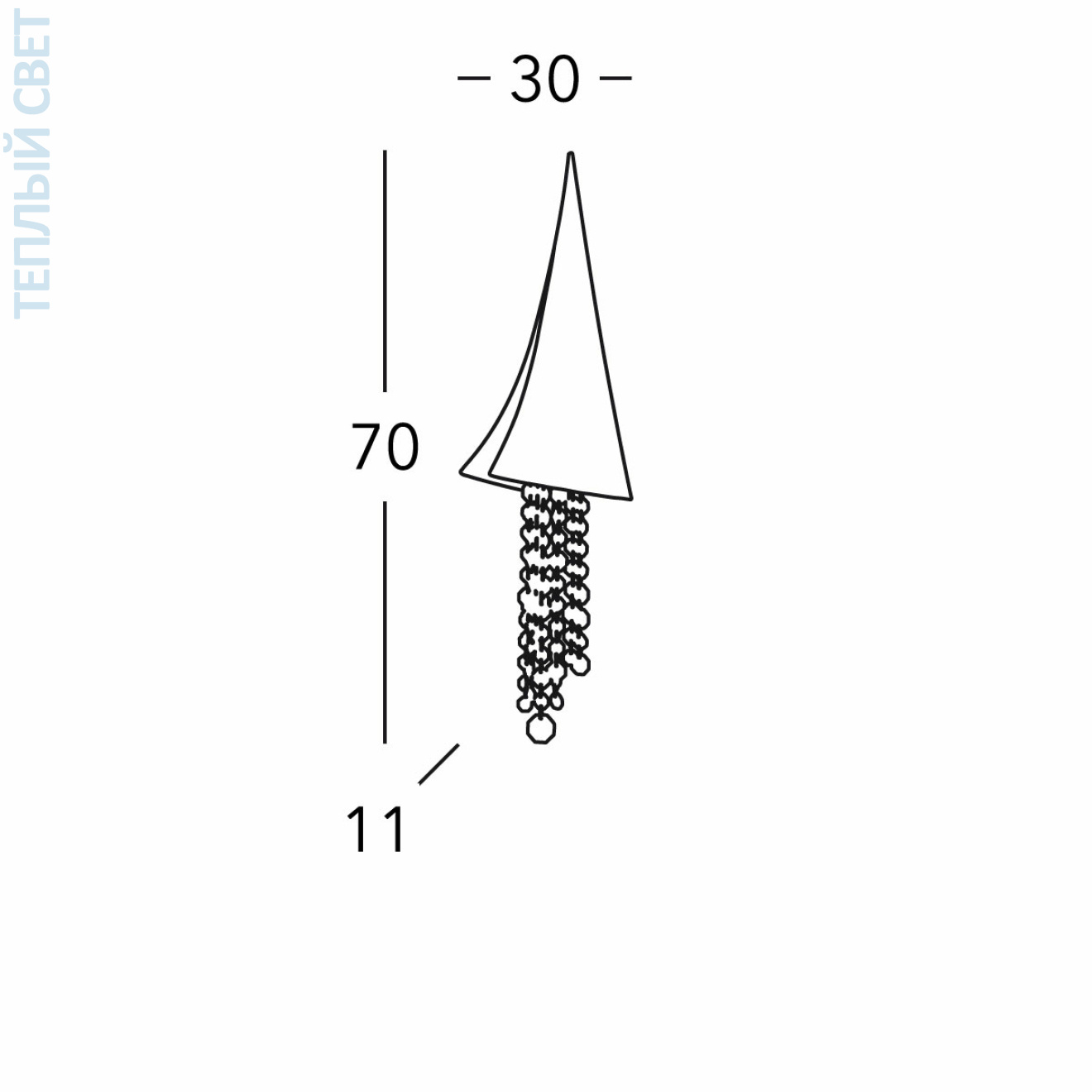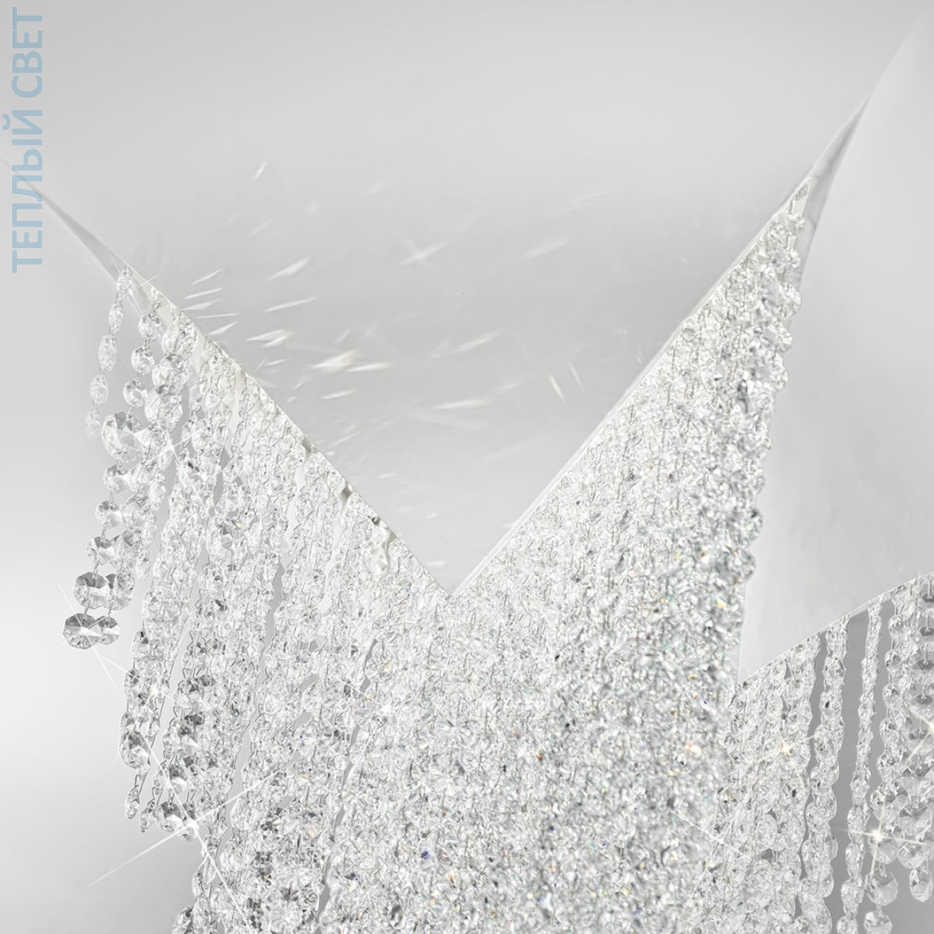 Настенный светильник с вертикально ориентированной композицией, где основной элемент — матовый белый корпус треугольной формы, закреплённый на стене, из которого вниз свисают каскады прозрачных кристаллов. Конструкция рассчитана на декоративное и акцентное освещение, при котором свет проходит через подвески и усиливает их оптический эффект. Габариты указаны как ширина 30 см и высота 70 см, используется одна светодиодная лампа с возможностью регулировки яркости. Такое исполнение делает изделие не только источником света, но и выразительным элементом оформления стены за счёт контраста гладкой поверхности корпуса и фактурной кристаллической части.