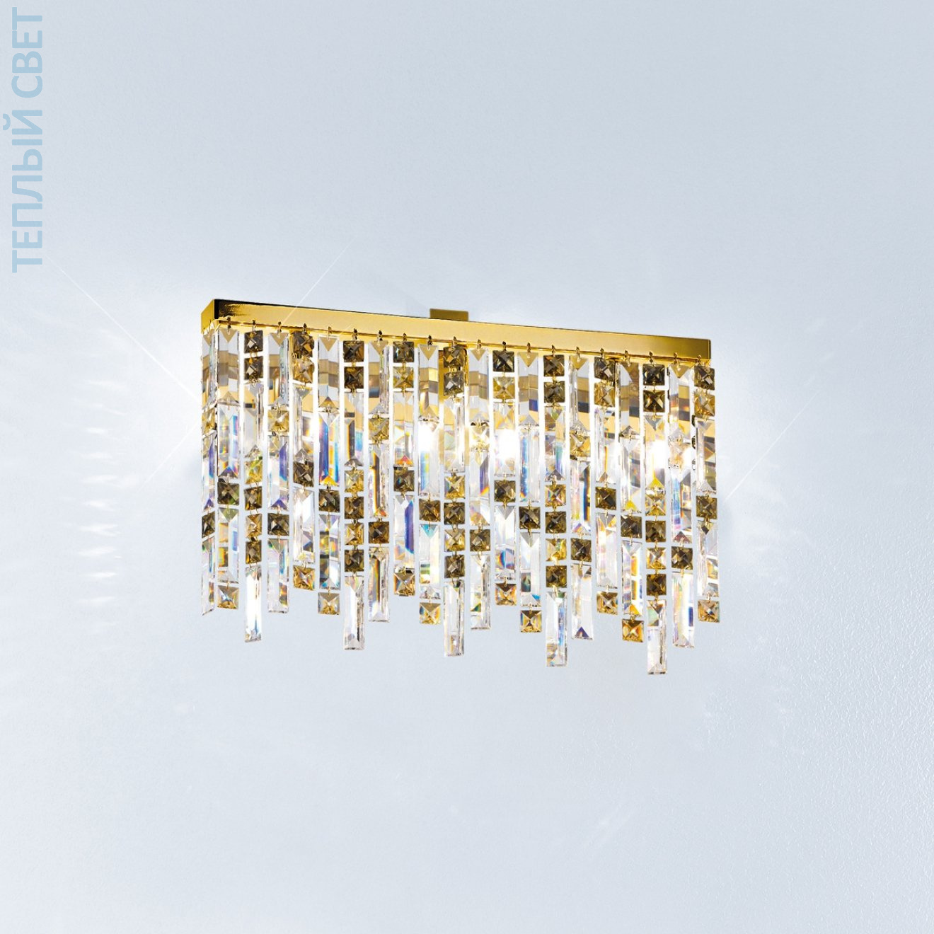 Настенный светильник Kolarz из коллекции Prisma с прямоугольным основанием и каскадной подвесной системой из кристаллических элементов. Корпус крепится к стене и выполнен с отделкой из золота 24 карата. От него вниз спускается несколько рядов вертикальных подвесок, состоящих из прозрачных и цветных квадратных кристаллов, соединённых в длинные цепочки, которые образуют плотную декоративную структуру. Нижний край формируют удлинённые кристаллические элементы разной длины, создающие ступенчатую линию подвеса. Такая конструкция частично закрывает источники света и формирует многослойную светорассеивающую поверхность. Светильник рассчитан на три лампы с цоколем G9. Ширина модели 50 см, высота 33 см. Артикул 1314.63.3.P1.KpTGn.