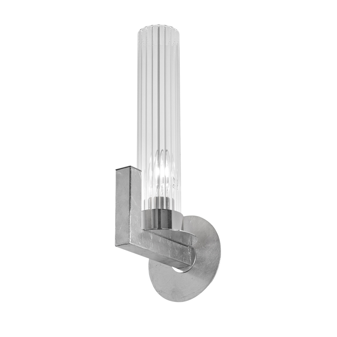 Настенный светильник Kolarz из коллекции Raggio предназначен для локального освещения и монтируется на стену через круглое основание с выносным держателем. Конструкция включает вертикально ориентированный прозрачный плафон с выраженной рифлёной поверхностью, внутри которого размещается одна лампа с цоколем E14. Основание и крепёж выполнены с отделкой под сусальное серебро, что задаёт характерный металлический оттенок конструкции. Светильник имеет вытянутые пропорции с высотой 36 см при ширине 17,2 см, благодаря чему формирует направленный вертикальный световой акцент и подходит для размещения в зонах дополнительного освещения. Артикул модели — 6009.60150.