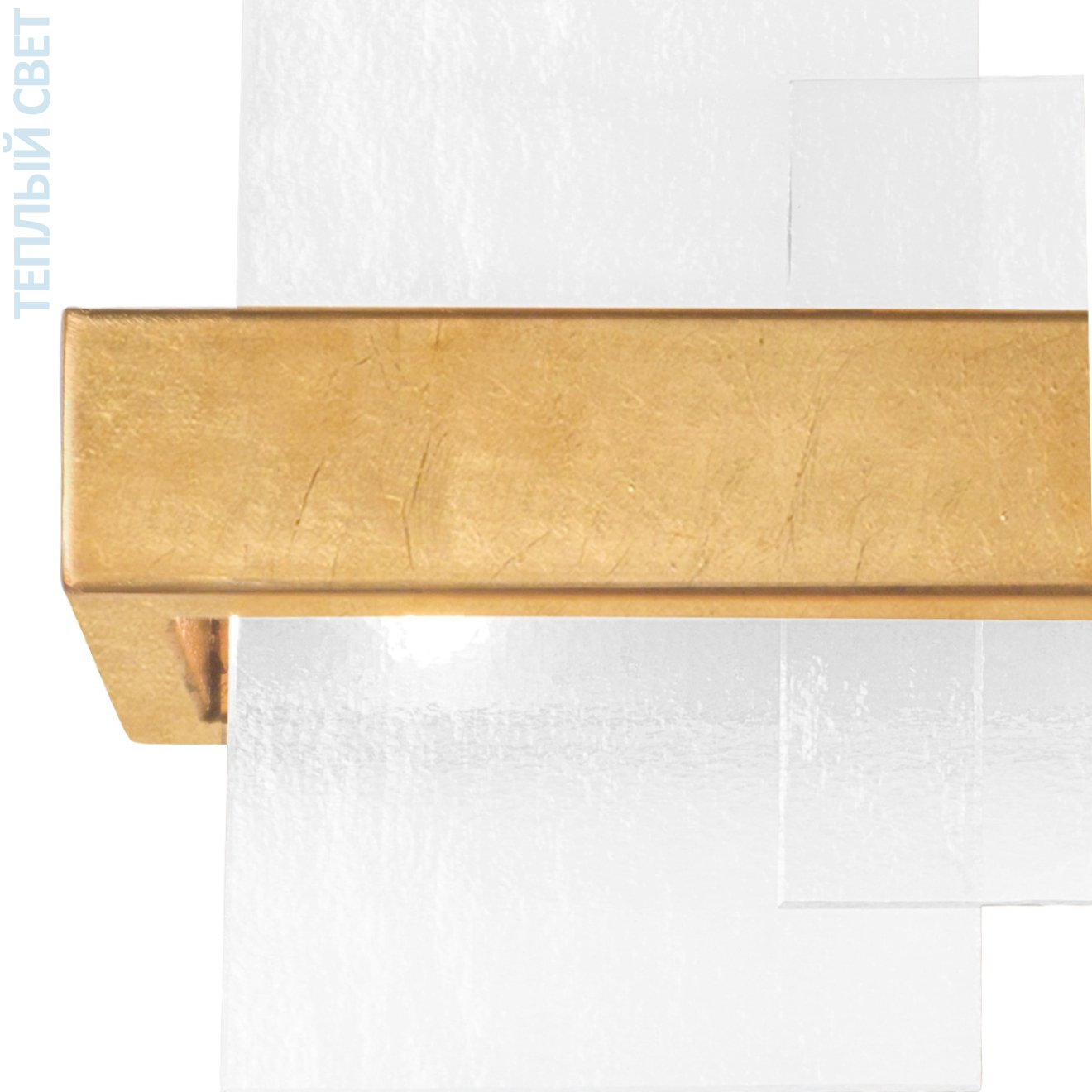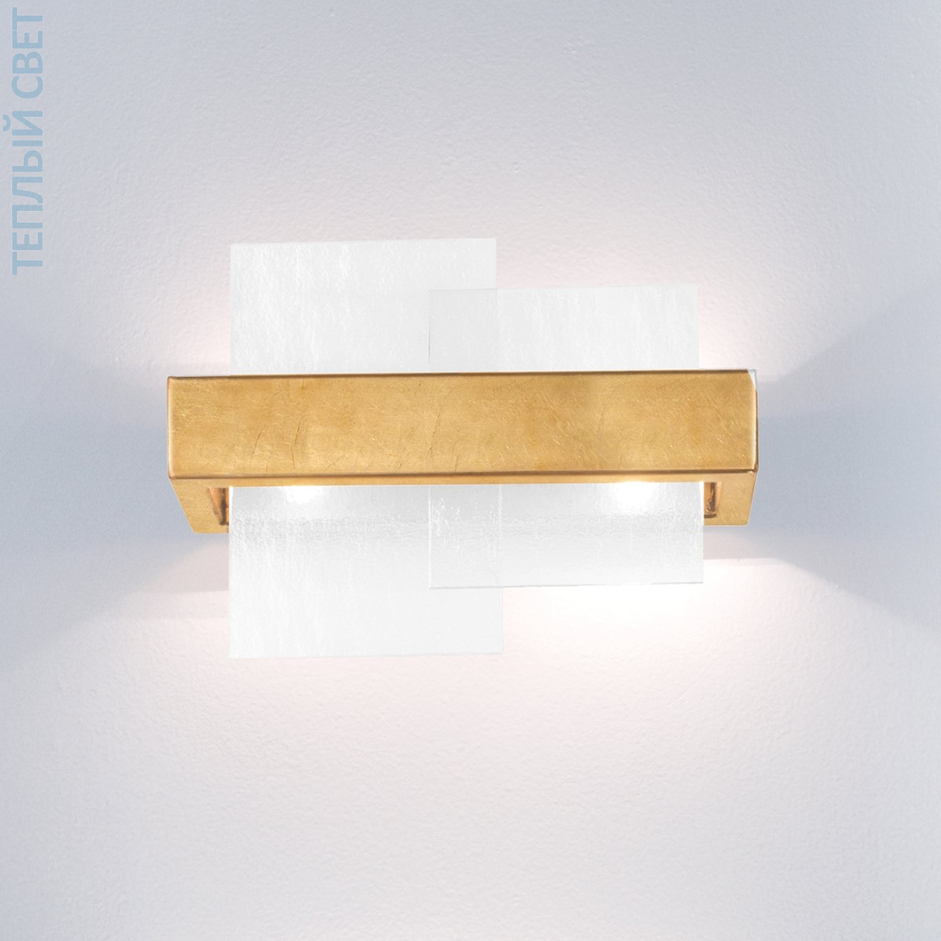 Настенный светильник с горизонтально ориентированной композицией, предназначенный для локального и декоративного освещения интерьера. Конструкция состоит из металлического корпуса с отделкой под сусальное золото, за которым расположены пересекающиеся прямоугольные пластины из белого материала, выполняющие роль рассеивателя. Источники света скрыты внутри и направляют поток на задние и боковые поверхности, создавая мягкое отражённое освещение. Светильник рассчитан на две лампы с цоколем G9. Габариты около 32 см в ширину и 24 см в высоту позволяют использовать его как одиночный элемент или в серии на стене.