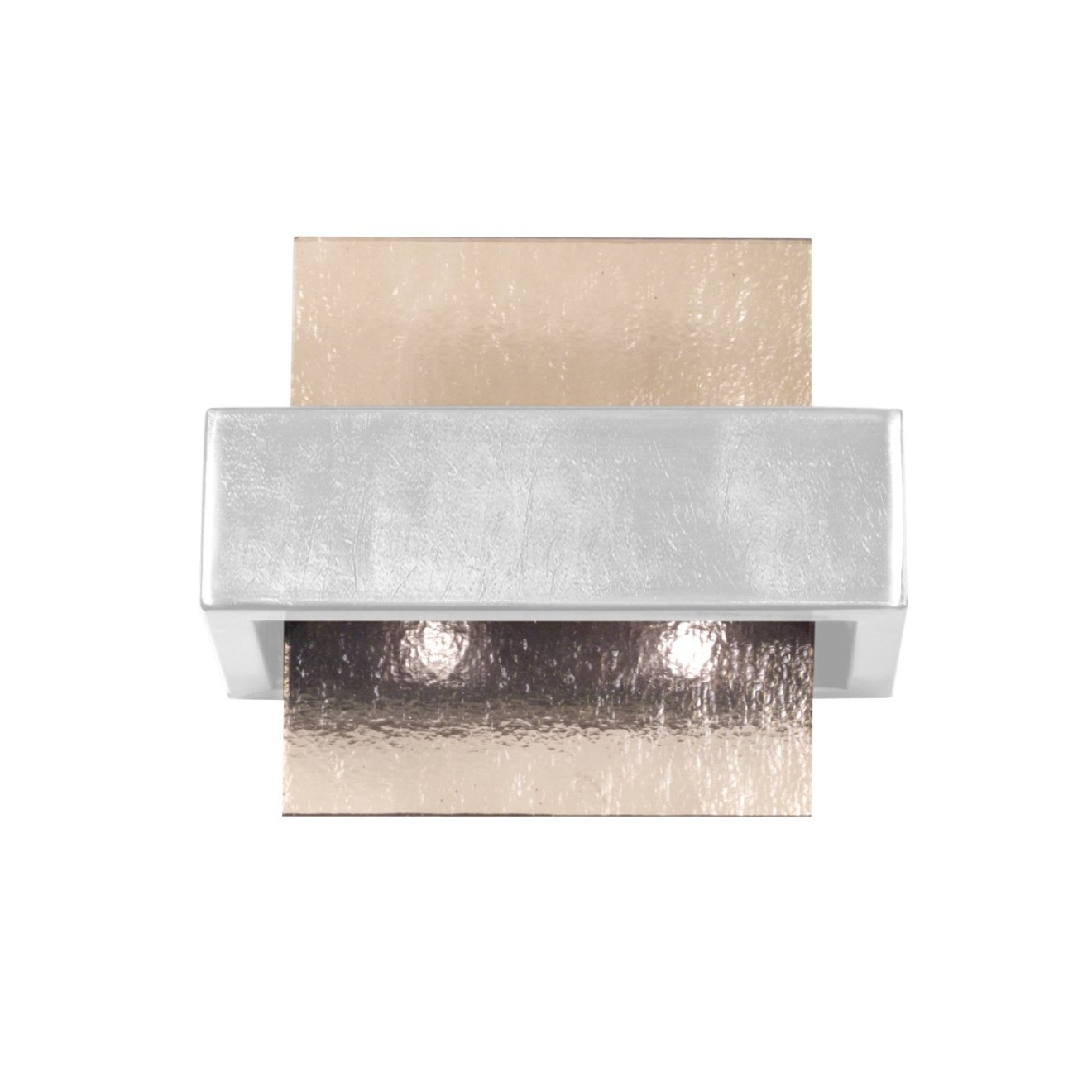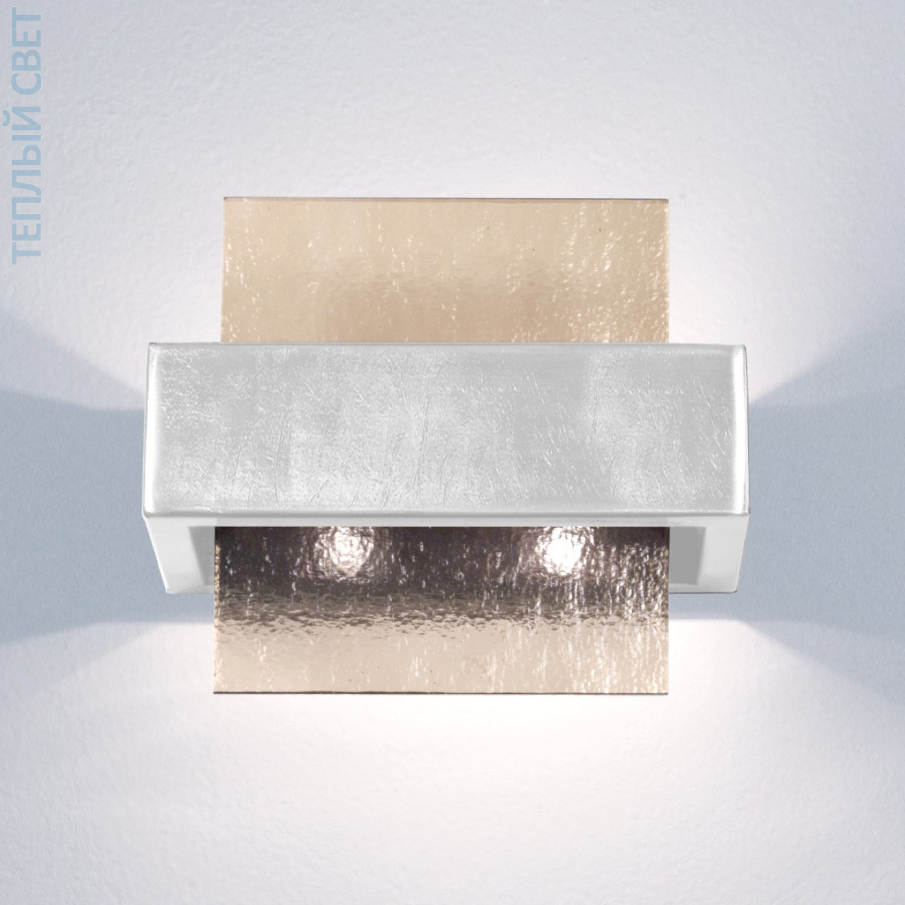 Настенный светильник прямоугольной формы крепится к стене и состоит из центрального металлического корпуса с отделкой brunito brushed и двух выступающих стеклянных панелей с эффектом fumé. Внутри размещены две лампы с цоколем G9, за счёт чего свет проходит через полупрозрачные пластины и распределяется вверх и вниз, формируя двусторонний световой поток. Ширина составляет около 21 см, высота — 17 см, что позволяет использовать модель как компактный источник локального освещения. Контраст между матовой металлической частью и тонированным стеклом задаёт характер распределения света и его интенсивность.