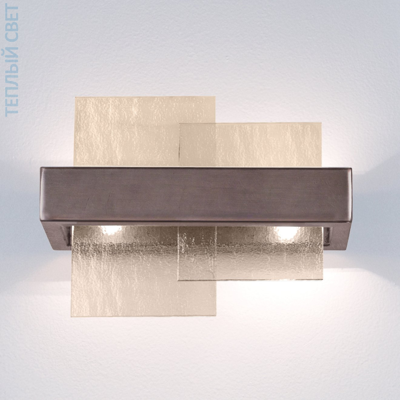 Настенный светильник предназначен для декоративной и локальной подсветки и крепится на стену с горизонтальной ориентацией. Конструкция состоит из прямоугольного металлического корпуса с отделкой brunito brushed, внутри которого размещены два источника света с цоколем G9, и нескольких наложенных стеклянных пластин с эффектом fumé, расположенных в разных плоскостях за корпусом. Стеклянные элементы частично перекрывают друг друга и рассеивают свет, формируя мягкое свечение вокруг светильника. Габариты составляют 32 см по ширине и 24 см по высоте. Модель относится к коллекции Rettangolo производителя Kolarz, артикул 6040.60260/Fm.