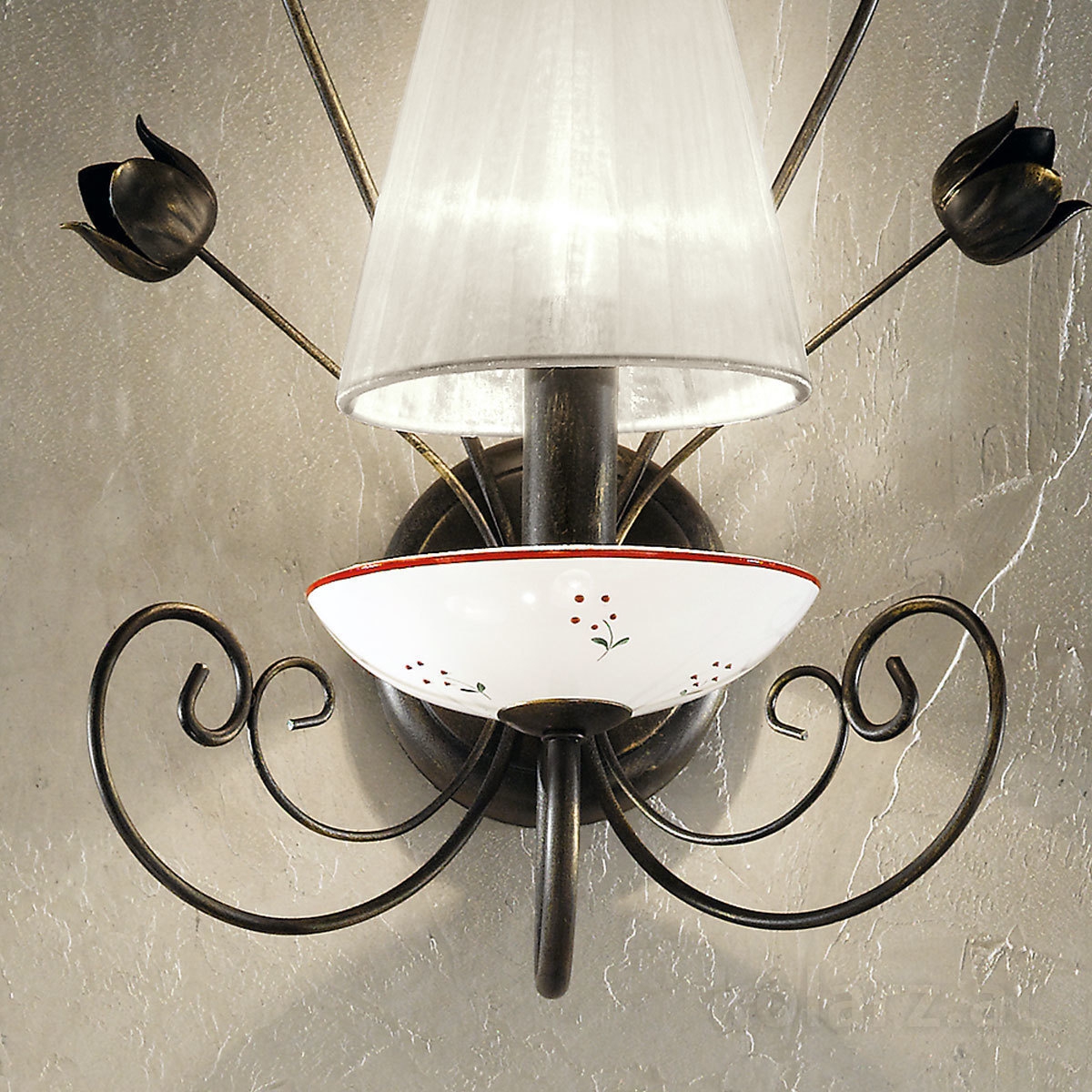 Настенный светильник на одну лампу E14 с текстильным абажуром и декоративной металлической основой в отделке черное золото. Модель построена на сочетании центрального плафона с изогнутыми завитками и небольшими элементами в форме бутонов, поэтому воспринимается не как нейтральное бра, а как заметная декоративная часть стены. По карточке светильник относится к коллекции Tiziana, имеет ширину 23 см и высоту 30 см, то есть подходит для локального освещения и одновременной поддержки общего оформления помещения. На интерьерном фото показано использование вместе с люстрой той же серии, что помогает понять его роль как настенного светильника-компаньона в единой композиции.