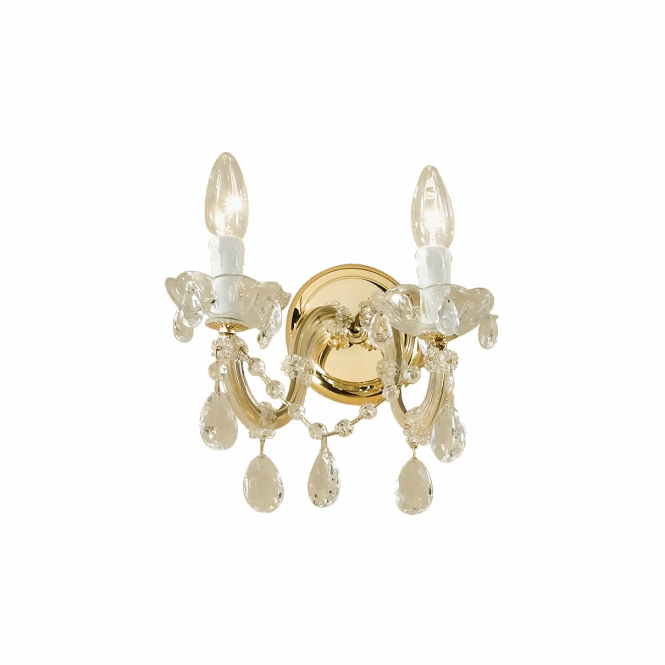 Настенный светильник с двумя источниками света, закреплёнными на центральном основании, рассчитан на декоративную и локальную подсветку. Конструкция включает металлическую круглую настенную чашу и изогнутые держатели, на которых размещены патроны под лампы с цоколем E14, выполненные в форме свечей. Основной визуальный элемент — подвески и декоративные детали из хрусталя, формирующие светопреломление и добавляющие объём конструкции. Габариты составляют 25 см по ширине и 27 см по высоте, вылет от стены около 20 см, что важно для размещения в проходных зонах или у изголовья. Использование двух ламп позволяет получить более насыщенную подсветку по сравнению с одиночными бра.