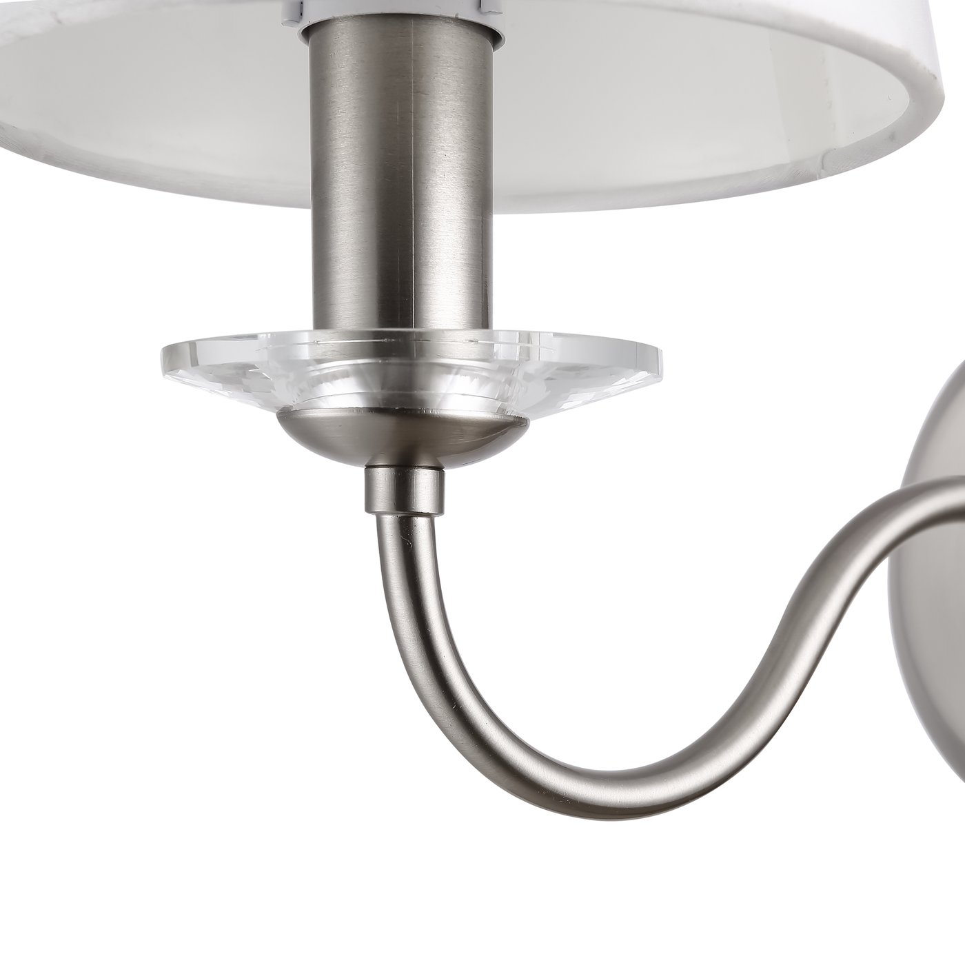 Настенное бра с классическим силуэтом на изогнутом кронштейне даёт мягкий локальный свет и подходит для прикроватной зоны, коридора или подсветки кресла. В коллекции Freya Osborn белый текстильный абажур конической формы закрывает лампу и распределяет поток вверх и вниз, поэтому свет получается спокойным и не слепит при взгляде сбоку. В реальном сценарии рядом с кроватью это удобно: когда человек поворачивается на подушке, источник остаётся скрытым тканью, а освещение остаётся ровным и комфортным. Никелированная арматура отражает минимум лишних бликов и визуально поддерживает аккуратную «металлическую» линию основания и держателя. Цоколь E14 рассчитан на лампу до 40 Вт, поэтому яркость можно подобрать под задачу — от приглушённого вечернего режима до более яркого света для чтения на близкой дистанции. Крепление на планку обеспечивает плотную установку к стене, а степень защиты IP20 предполагает использование в сухих жилых помещениях.