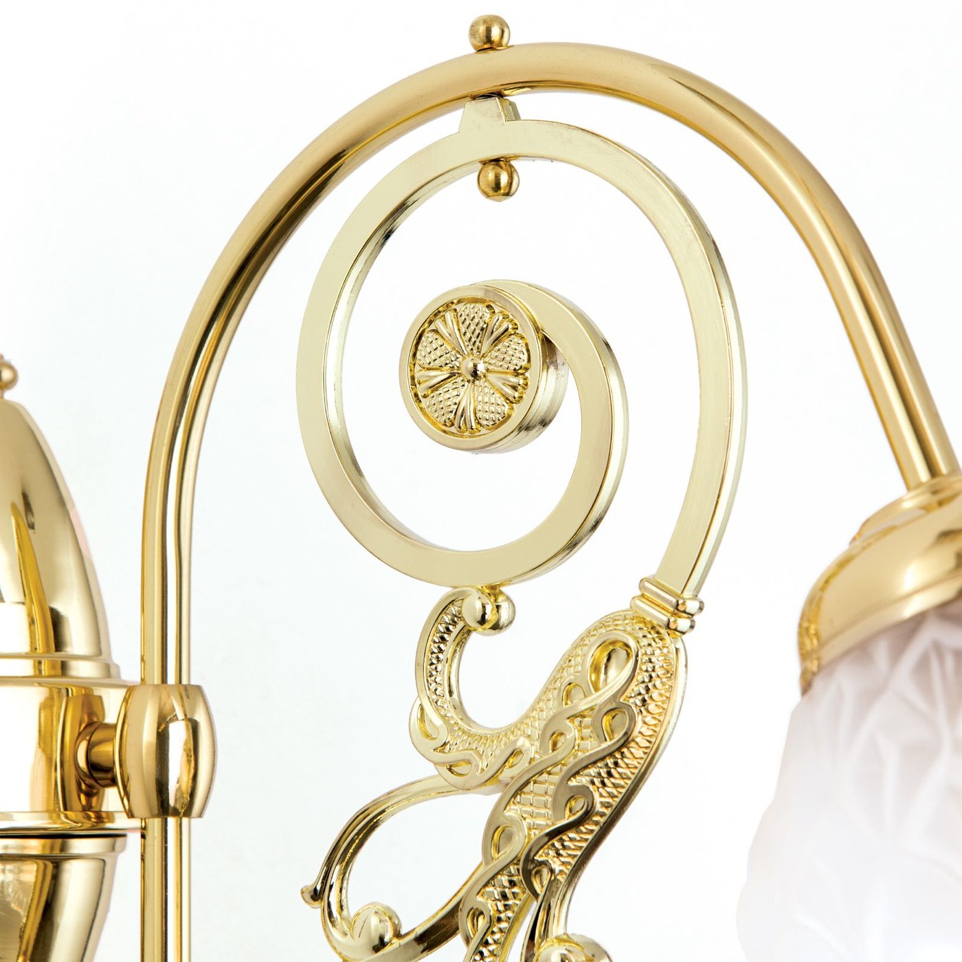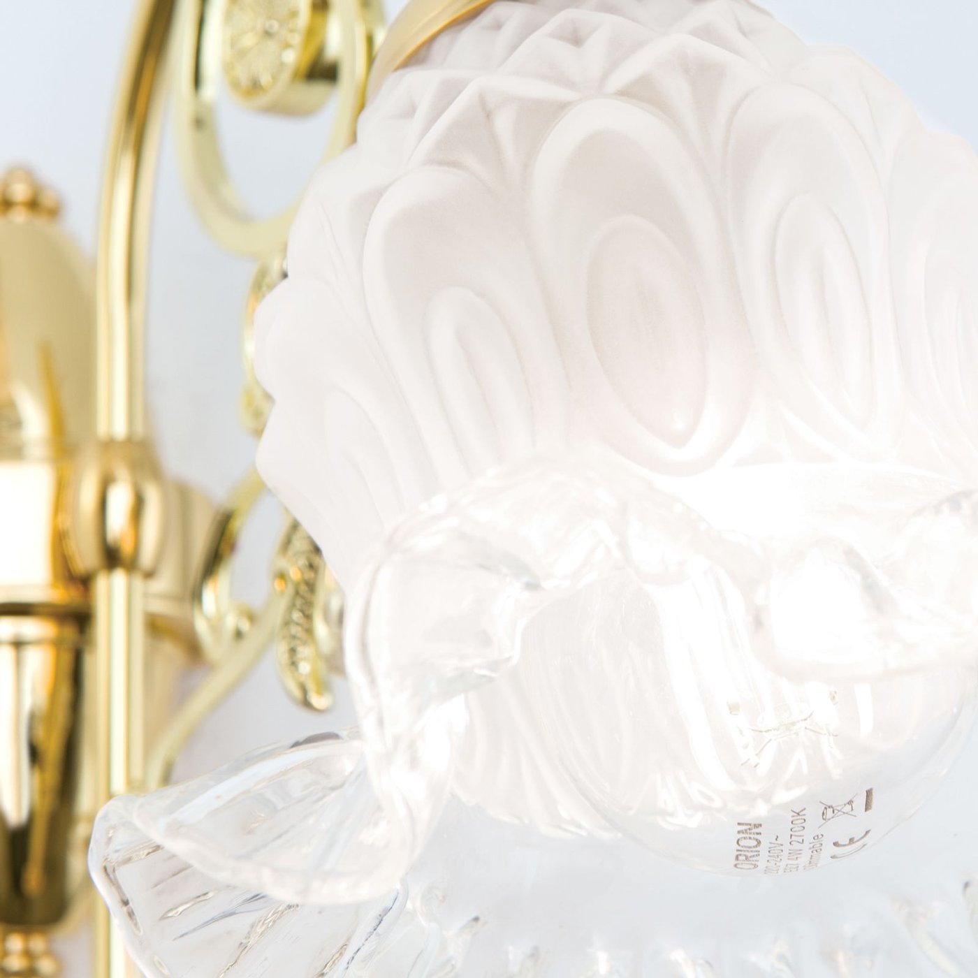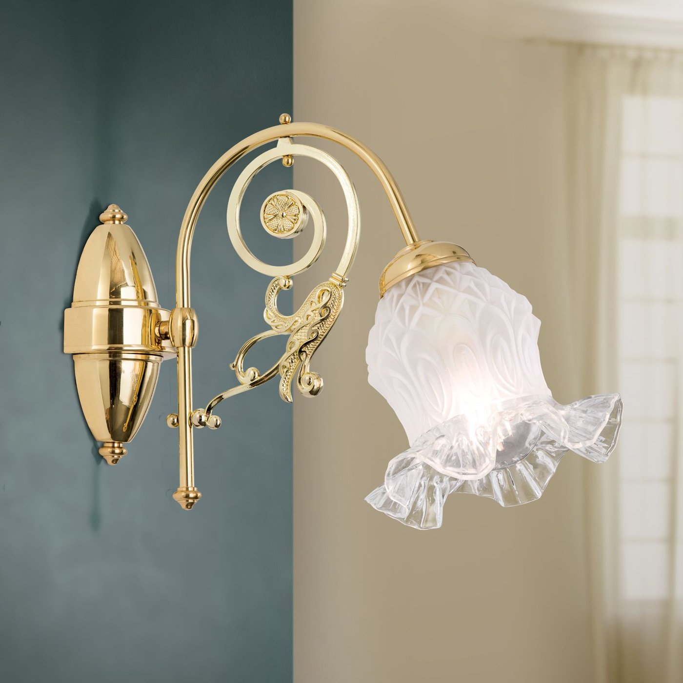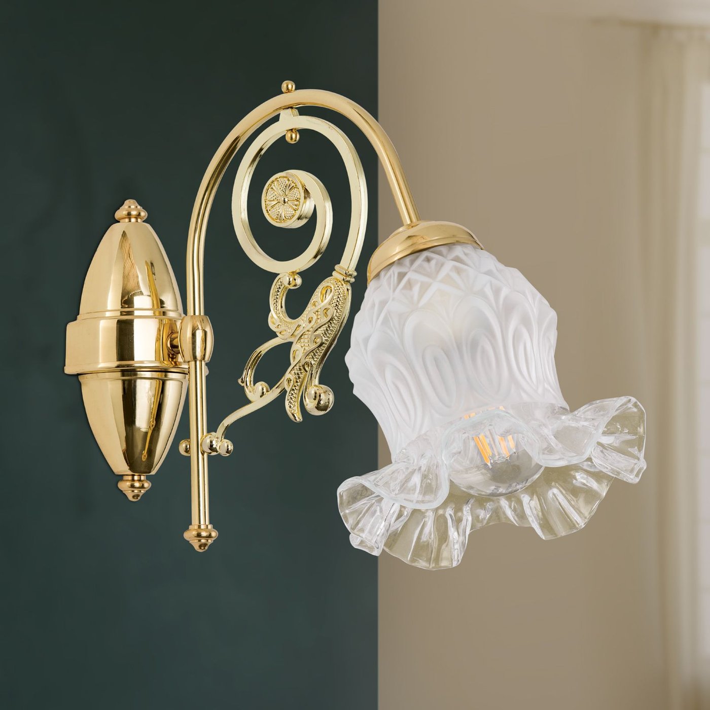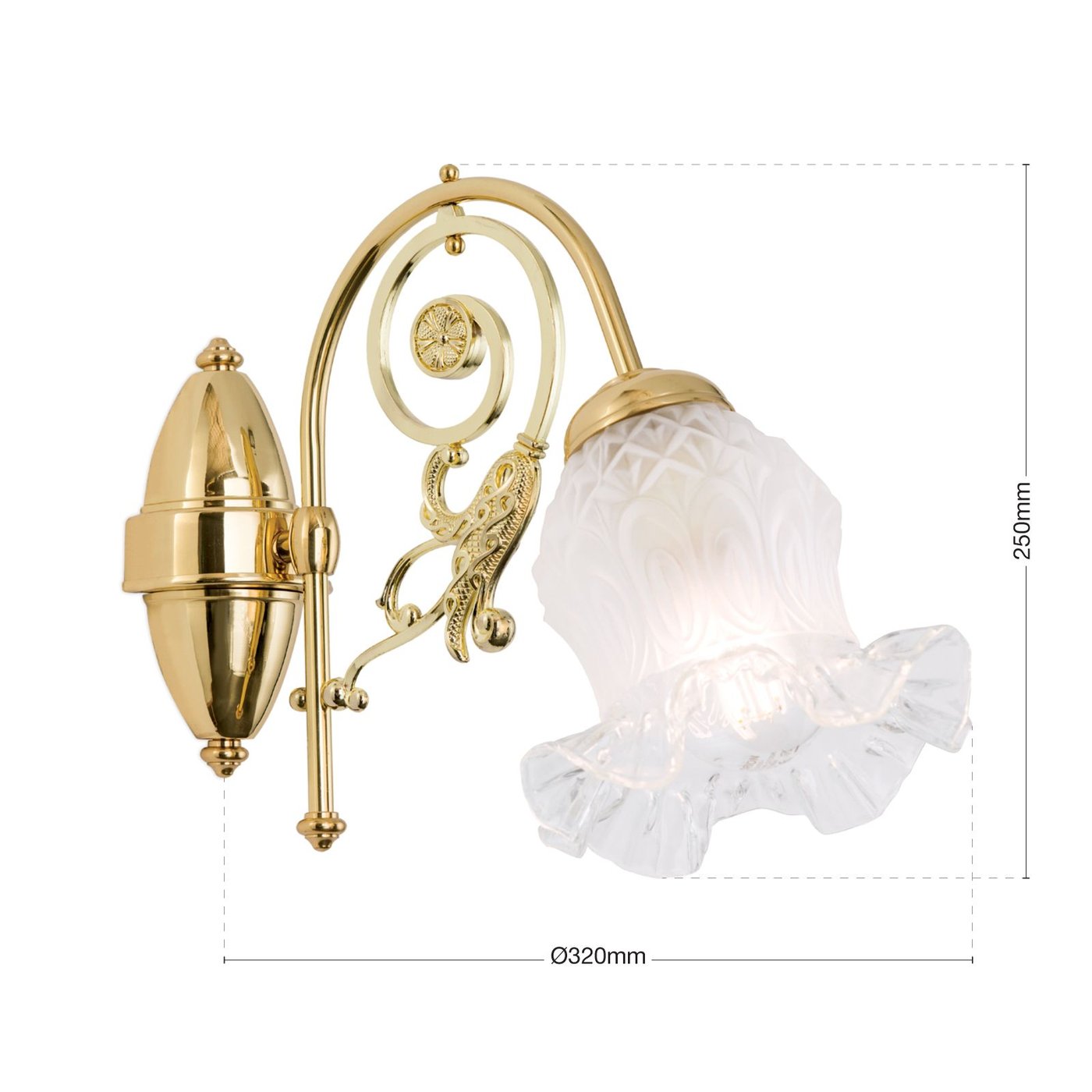 Настенное бра с одним источником света на декоративном кронштейне, где основная конструкция построена на изогнутой латунной дуге с дополнительными орнаментальными элементами. Световой модуль вынесен вперёд и завершён стеклянным плафоном в форме цветочного бокала с волнистым краем, который частично рассеивает свет и направляет его вниз и в стороны. Основание крепится к стене через круглую розетку, корпус выполнен из латуни с полированной поверхностью. Используется одна лампа с цоколем E27 мощностью до 60 Вт, поддерживается диммирование. Габариты составляют около 25 см по высоте и 32 см по вылету, что важно учитывать при размещении рядом с проходами или мебелью.