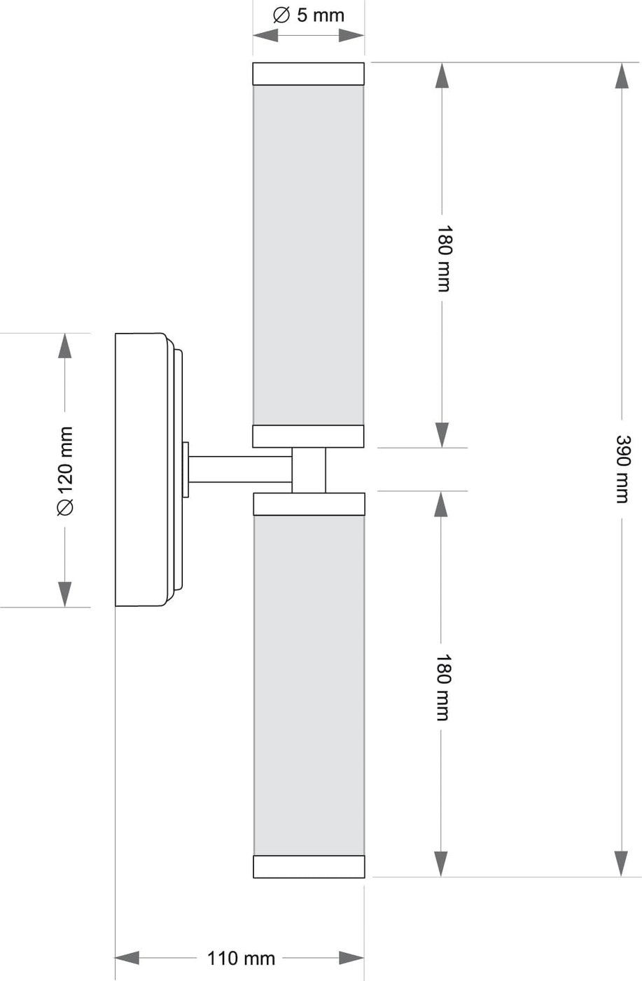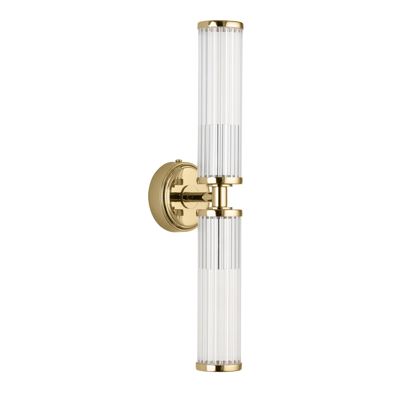 Компактное вертикальное бра с двумя рифлёными цилиндрическими рассеивателями закреплено на круглой латунной розетке и выносится от стены на 390 мм. В коллекции Saletto фабрики Kutek модель рассчитана на две лампы и формирует направленный вверх и вниз световой поток, который работает как акцентный свет в зоне зеркала, ниши или изголовья кровати. При размещении по обе стороны прохода свет вытягивает стену по вертикали, а при повороте головы не возникает резкого ослепления благодаря закрытой конструкции рассеивателей. Ширина 110 мм делает бра визуально лёгким, при этом высота 390 мм позволяет получить протяжённый световой столб. Две лампы E14 мощностью до 40 Вт каждая дают достаточный поток для локальной подсветки без перегрузки пространства. Золотая отделка латуни смягчает отражения и поддерживает тёплый оттенок света, что важно при использовании прозрачных источников.