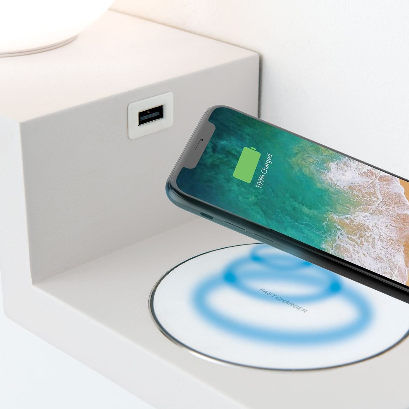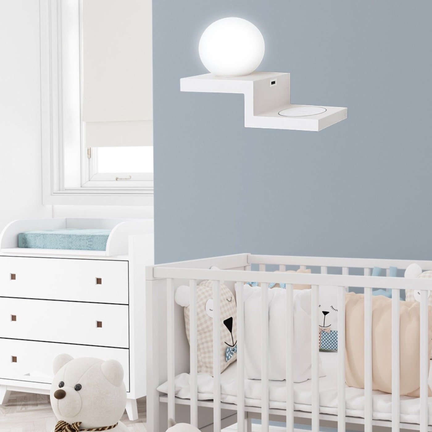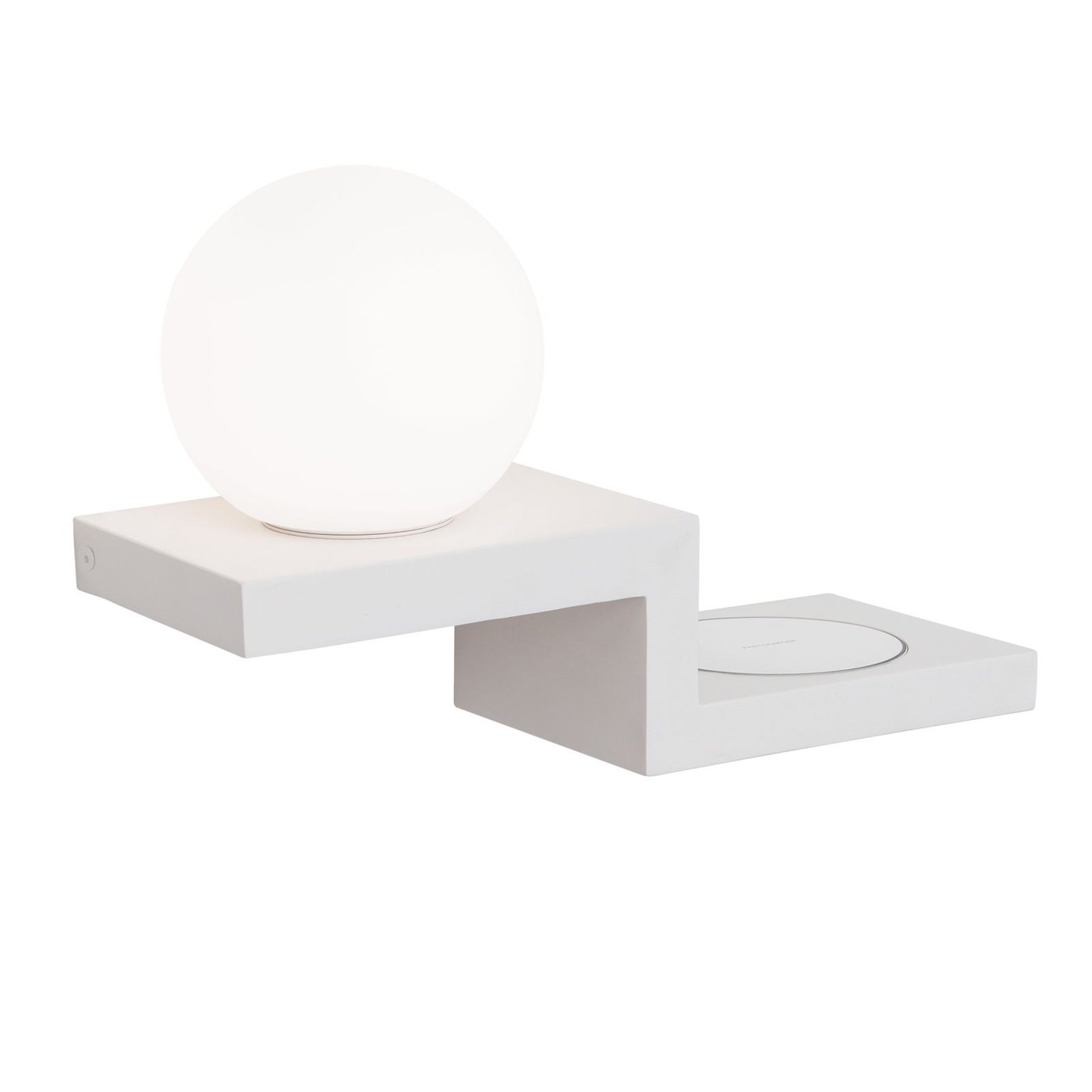 Настенный светильник с интегрированной полкой и функцией зарядки, где круглый матовый плафон из стекла установлен на горизонтальной площадке, закреплённой на ступенчатом металлическом основании. Конструкция объединяет источник света и поверхность для размещения предметов, при этом в полке предусмотрена зона индукционной зарядки Qi, а также подключение через USB-порт. Светодиодный модуль даёт световой поток 445 лм с температурой 3000 K, управление осуществляется выключателем снизу, диммирование не предусмотрено. Габариты составляют 32 × 17,5 × 12 см, диаметр плафона — 10 см, степень защиты IP20, что указывает на использование внутри помещений.
