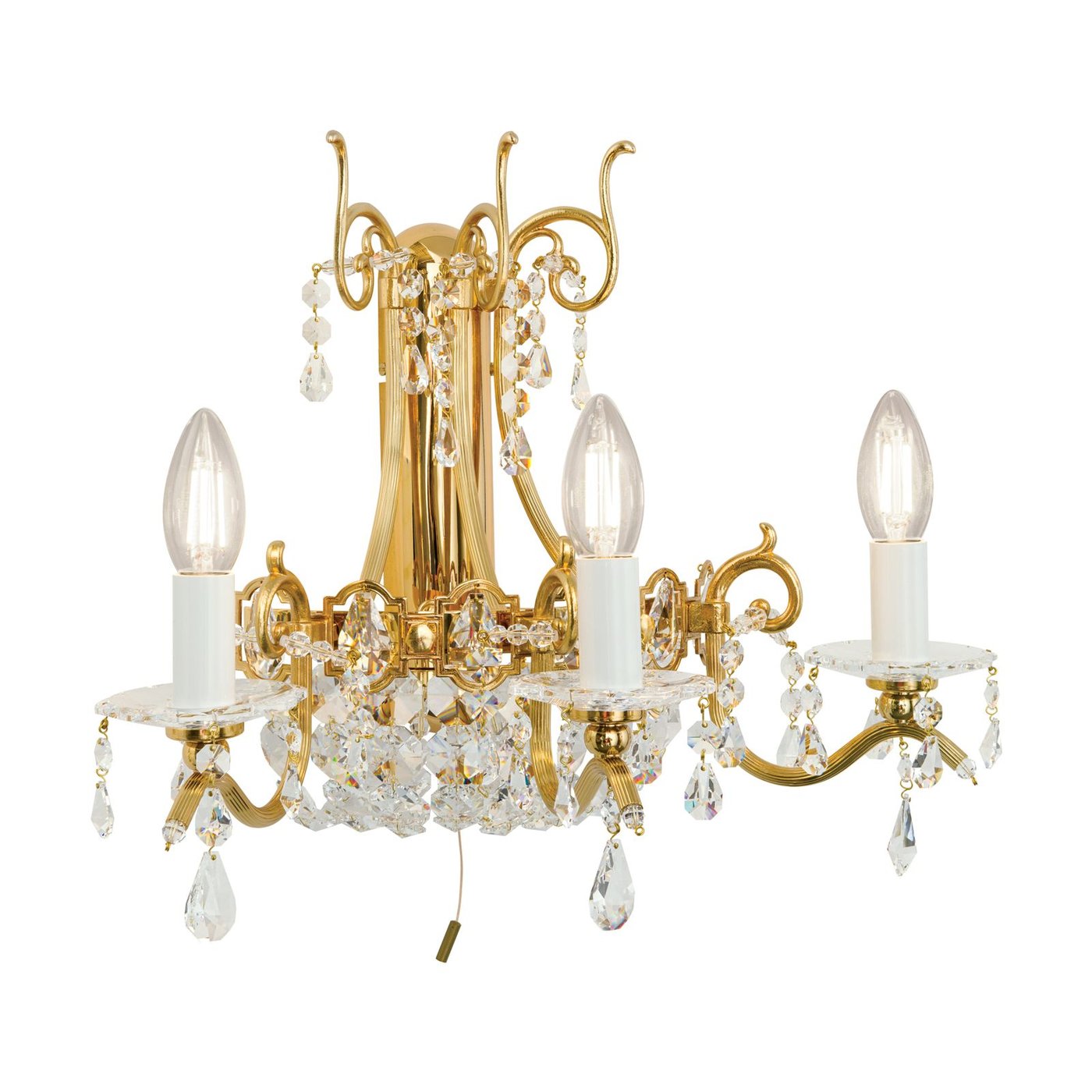 трёхрожковое хрустальное настенное бра с декоративной арматурой в золоте