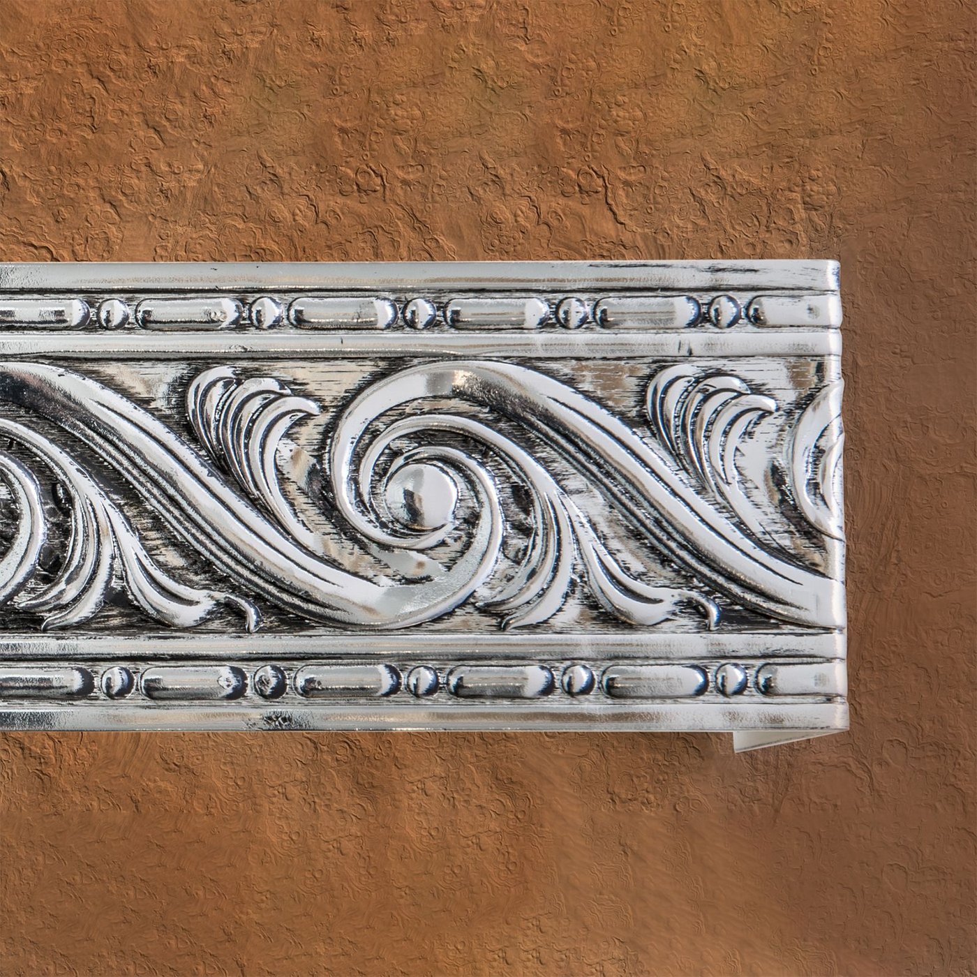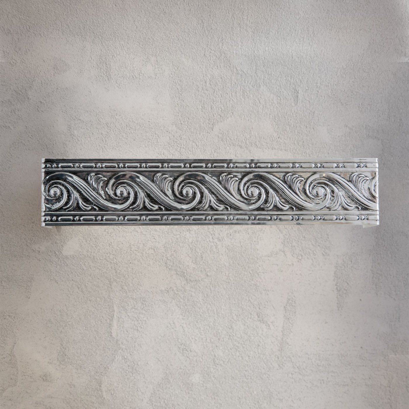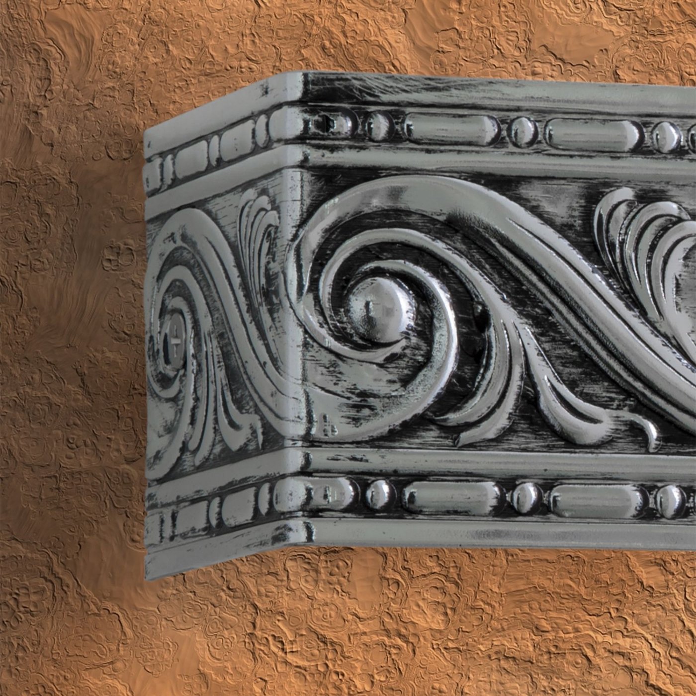 Настенный светильник линейного типа предназначен для декоративной и фоновой подсветки интерьеров и монтируется на поверхность стены. Корпус вытянутой прямоугольной формы выполнен из стали и дополнен рельефным металлическим декором с орнаментом, проходящим по всей длине. Источник света скрыт внутри корпуса и создаёт направленное рассеянное свечение вдоль стены. Длина светильника составляет около 300 мм при высоте и глубине по 60 мм. Встроенный светодиодный модуль обеспечивает световой поток около 1300 лм при цветовой температуре 3000 K. Степень защиты IP20 рассчитана на использование в сухих помещениях.