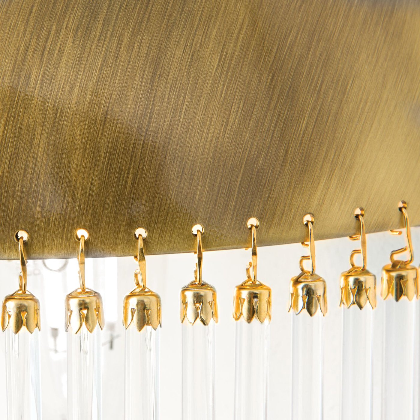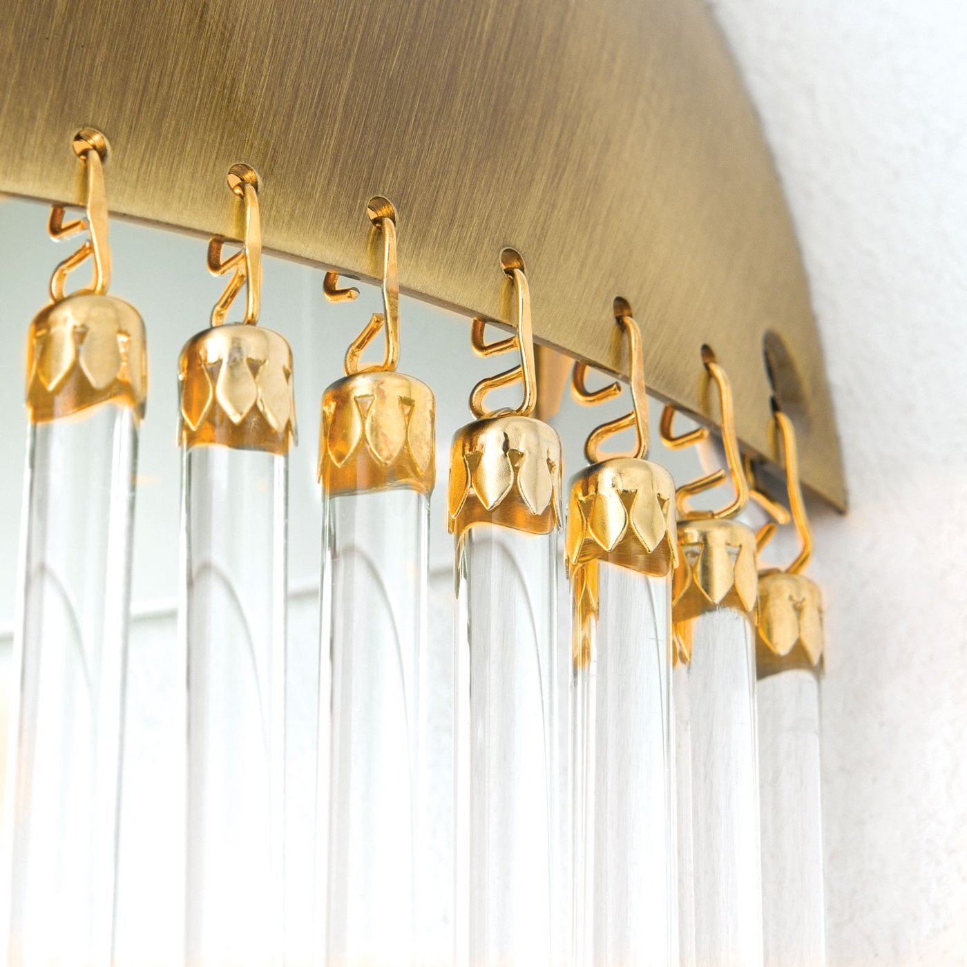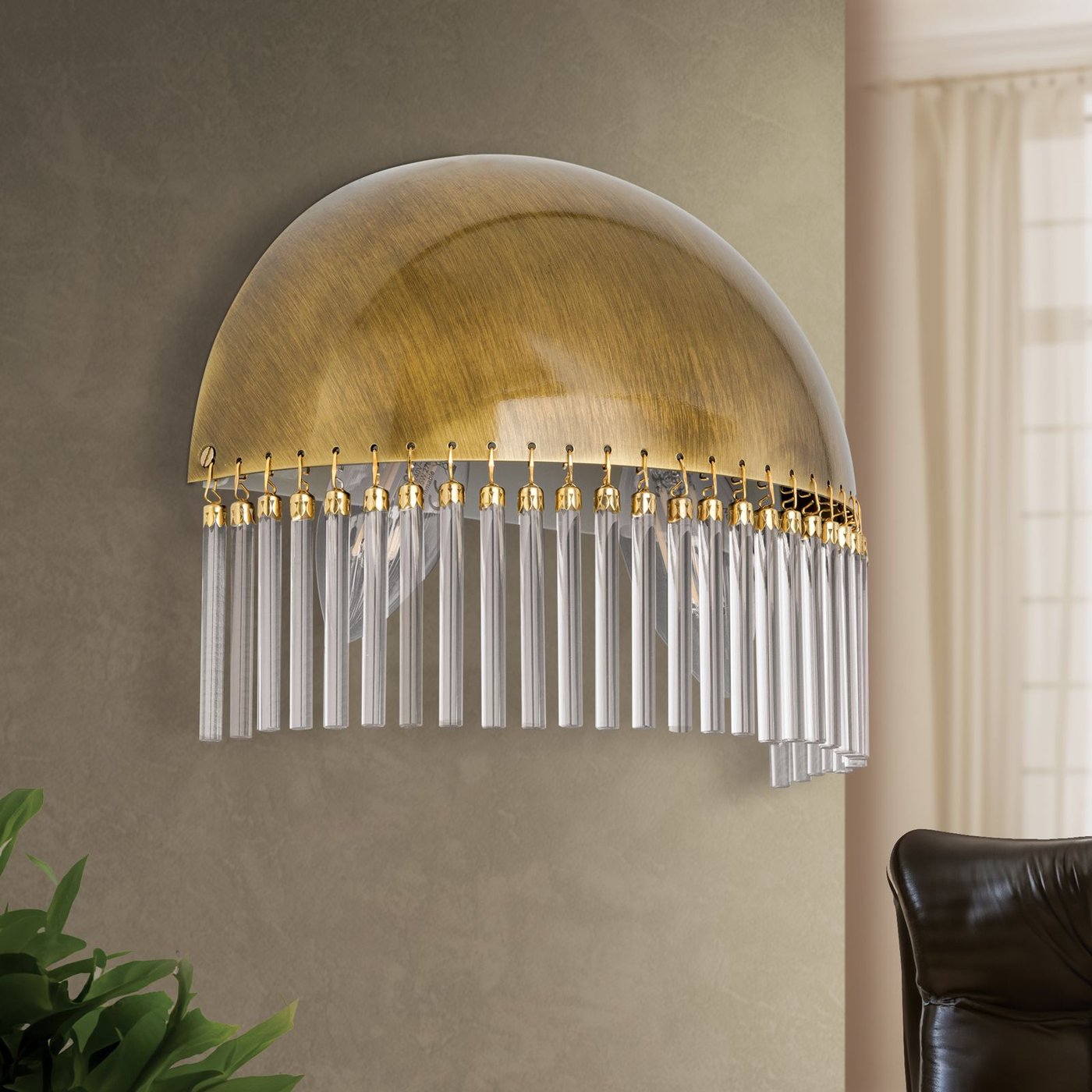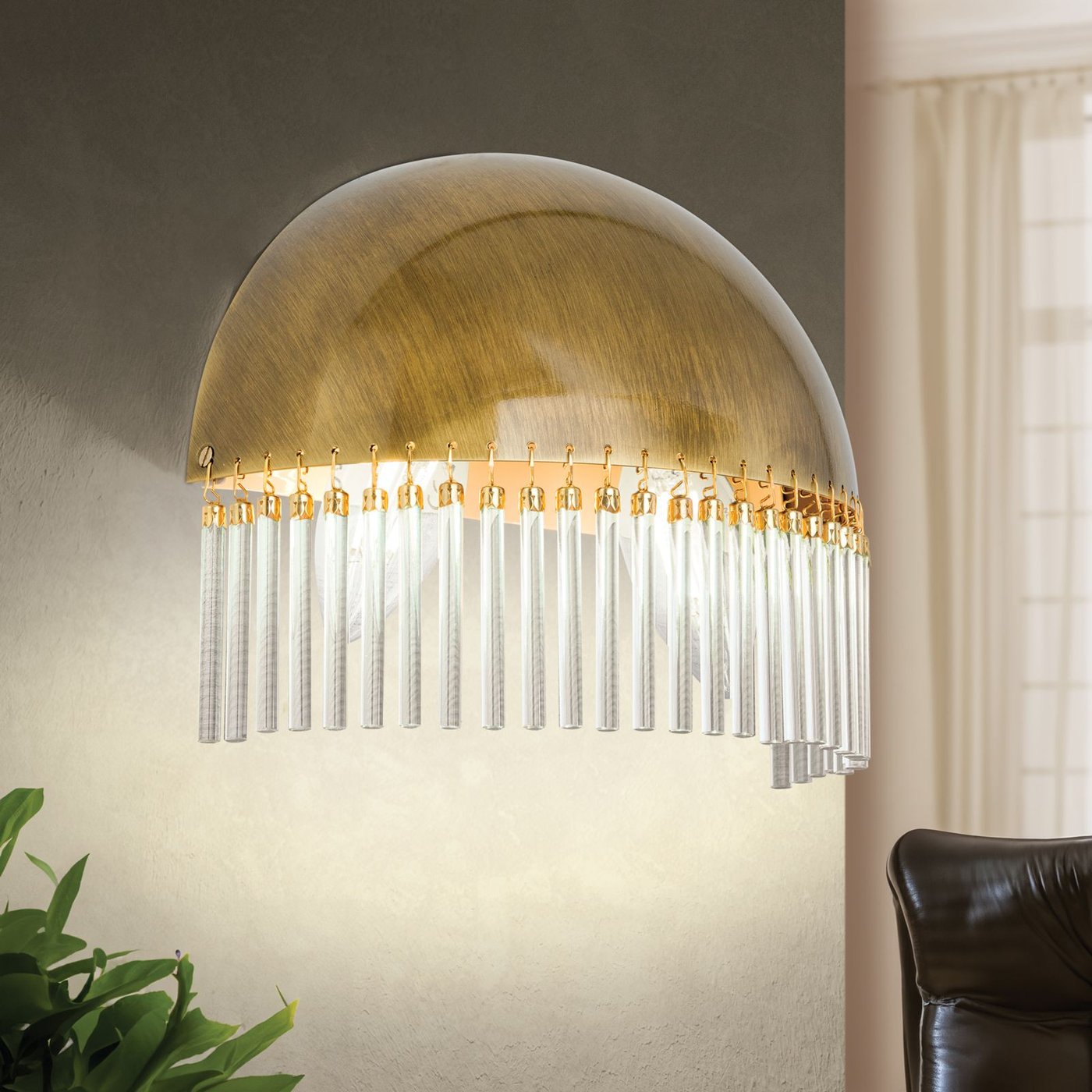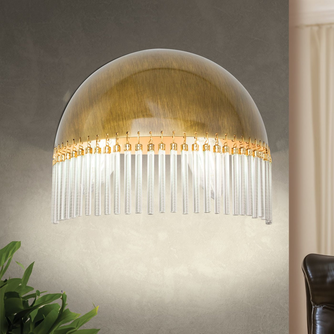 Настенное бра WA 2-587/2 Patina воспринимается как интерьерный объект с выразительной визуальной плотностью: полукруглый латунный корпус с патинированной отделкой и стеклянные подвески создают осязаемый ритм и структуру, заметную на стене. Когда включаешь свет, лучи мягко проходят через стеклянные стержни, рассеиваясь по поверхности стены и формируя теплое, мерцающее свечение, которое меняется при движении по комнате. Бра работает как точка акцентного освещения: каждый стеклянный элемент улавливает свет и создаёт игру бликов, при этом два цоколя E14 позволяют варьировать яркость и атмосферу. Компактные размеры — ширина 20 см, высота 17 см и глубина 10 см — делают бра заметным, но не громоздким, а материал корпуса обеспечивает долговечность и тактильную плотность при прикосновении. Этот объект одновременно функционален и декоративен: движение руки вдоль корпуса или взгляд с разных углов раскрывает глубину текстуры и ритм подвесок, подчёркивая сложность конструкции и создавая ощущение тщательно продуманного интерьера.