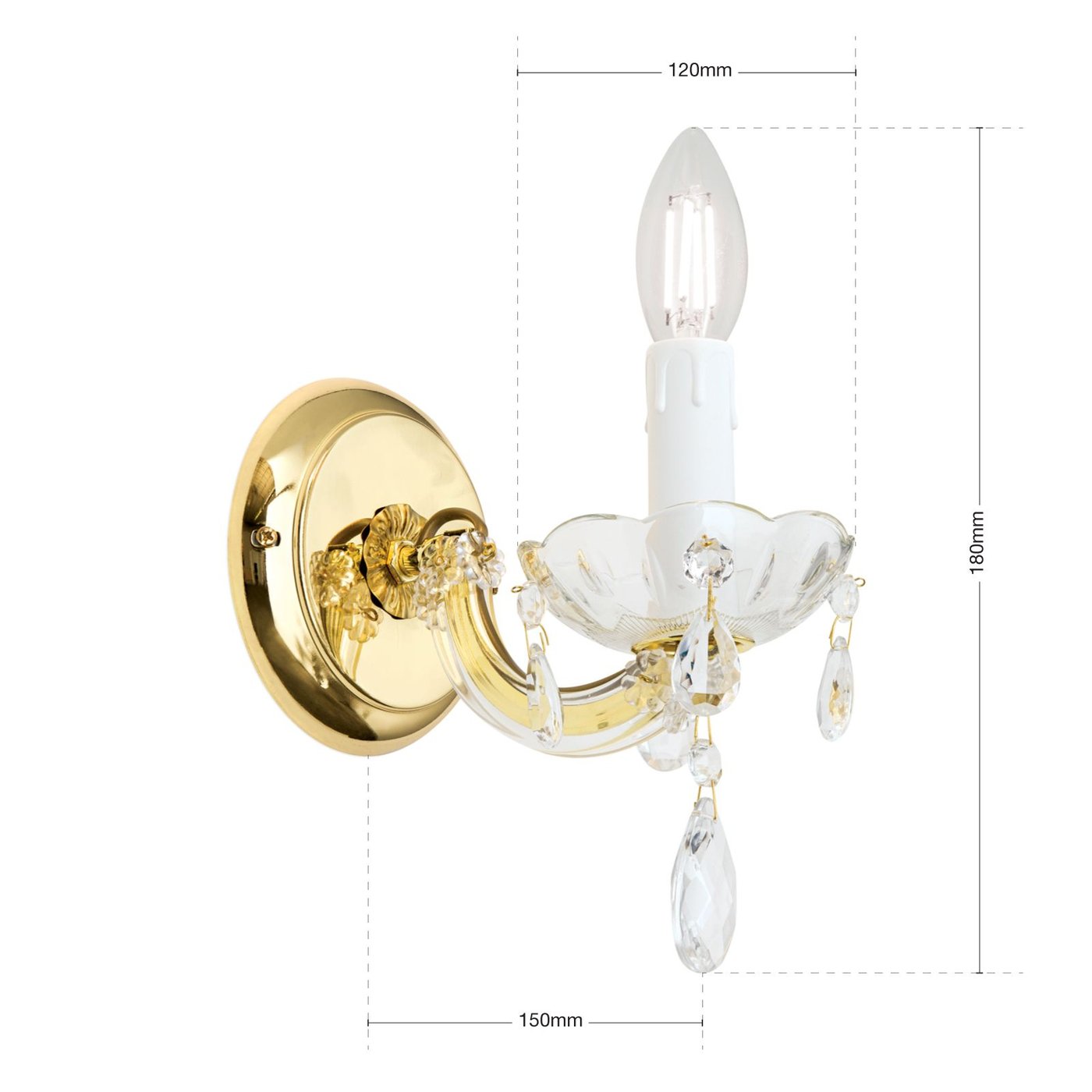 Настенный светильник с одним пламенем из серии MARIE CLAIRE наполнит любую комнату меланхоличной магией былой славы, хотя, безусловно, теперь удобнее отказаться от свечей для большого освещения. Уютное мерцание, аромат воска, сдержанная элегантность золота и хрусталя вызывают воспоминания о тех временах в чарующем свете, и настенный светильник MARIE CLAIRE переносит нас в это путешествие. Цоколь E14 рассчитан на мощность до 40 Вт. Для этого настенного светильника используются энергосберегающие светодиодные лампы Wind Gust Candle, которые экономят электроэнергию и деньги. Помимо других настенных светильников, серия MARIE CLAIRE также включает в себя следующие люстры: на 15, 9, 8 и 5 ламп.