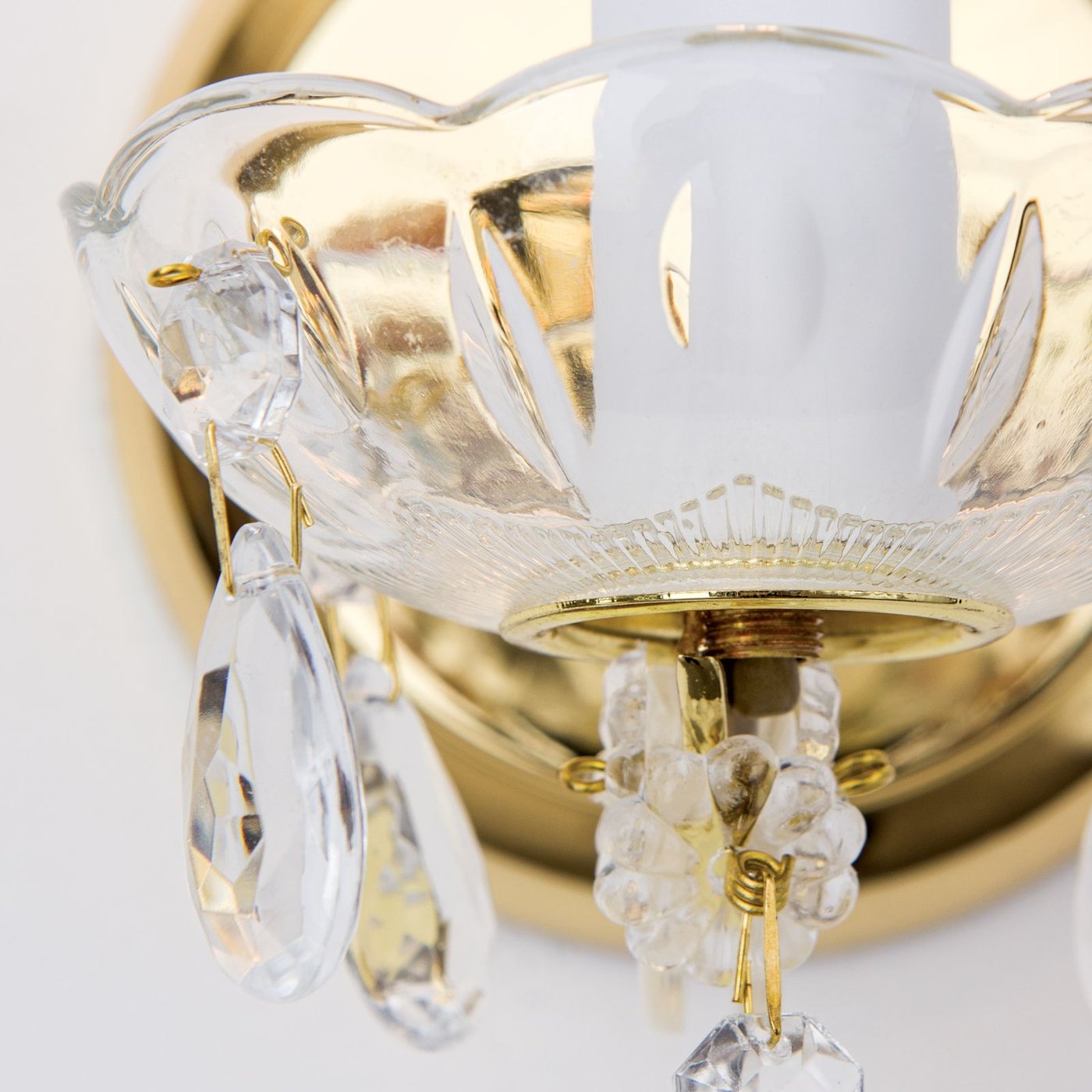 одноламповое настенное бра с хрустальными подвесками и золотистой арматурой