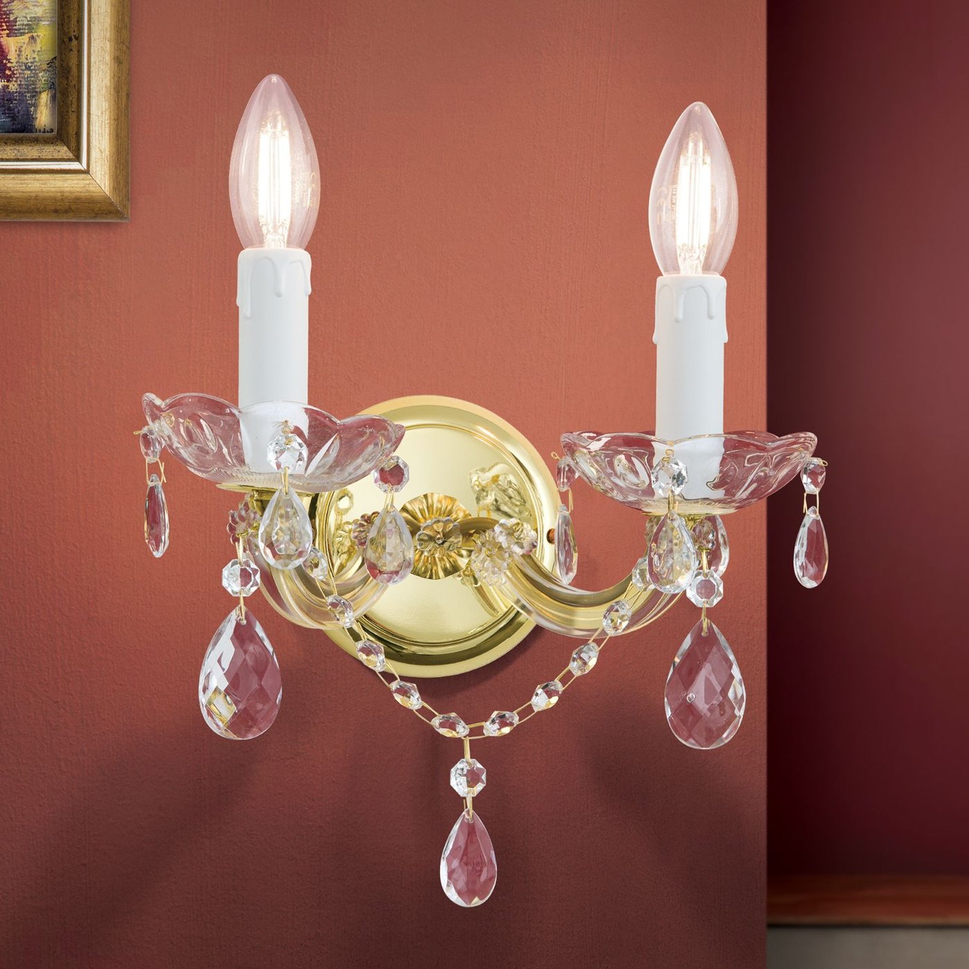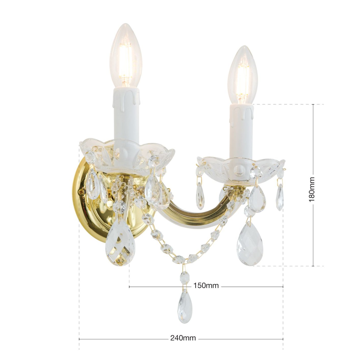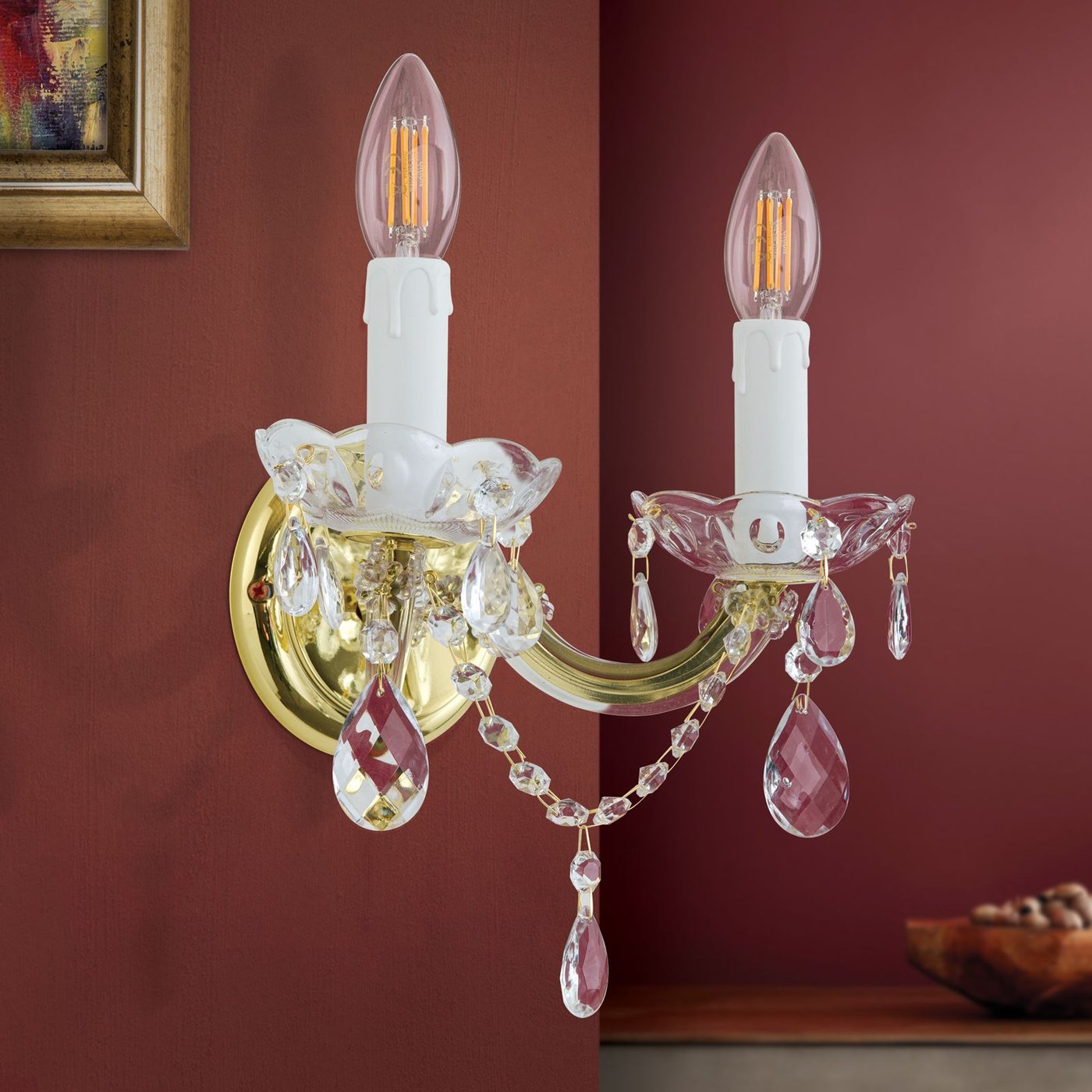 Двухпламенный настенный светильник из серии MARIE CLAIRE можно назвать настенным украшением благодаря своему изысканному внешнему виду. Подобно тиаре, венчающей голову знатного человека, этот светильник возносит комнату до аристократического уровня. Высококачественное стекло, кристаллы, цепи, золотая настенная розетка: всё излучает безмятежную красоту. Лампы Wind Gust Candle создают идеальную картину. Настенный светильник с двумя цоколями E14 обеспечивает мощность до 40 Вт каждый. И последнее, что стоит отметить, заботясь об окружающей среде: энергосберегающие светодиодные лампы помогают. Помимо однопламенного настенного светильника, существуют 9-, 8- и 5-ламповые варианты.