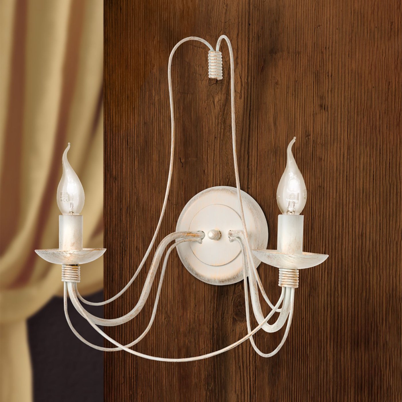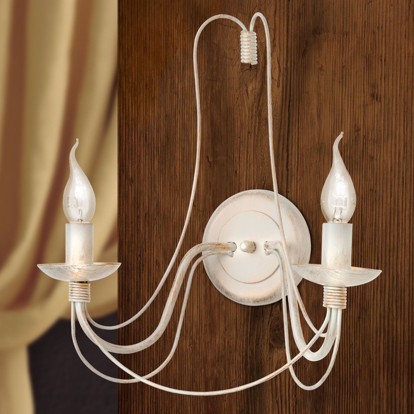 двухламповое настенное бра с плавными декоративными рожками и свечевидными лампами в оттенке слоновой кости