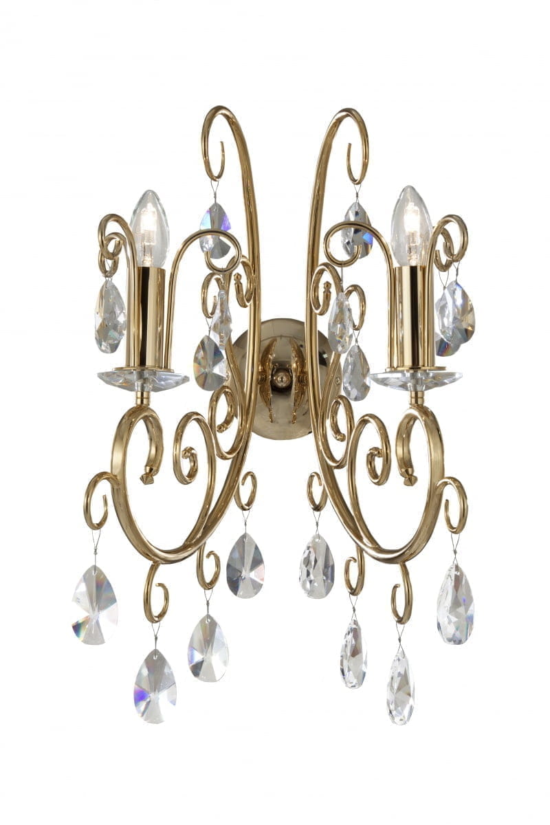 Настенный светильник предназначен для внутреннего освещения и выполнен из позолоченной латуни с декоративными кристаллами. Конструкция включает два держателя для ламп на изогнутых металлических элементах, из которых свисают подвесные кристаллы, создавая рассеянное и декоративное освещение. Лампы размещены вертикально, а металлическая рамка с плавными линиями формирует симметричную композицию. Светильник фиксируется на стене с помощью задней монтажной пластины, обеспечивая устойчивость и правильное положение декоративных элементов. Дизайн ориентирован на визуальный акцент и эффектный световой рисунок в интерьере.