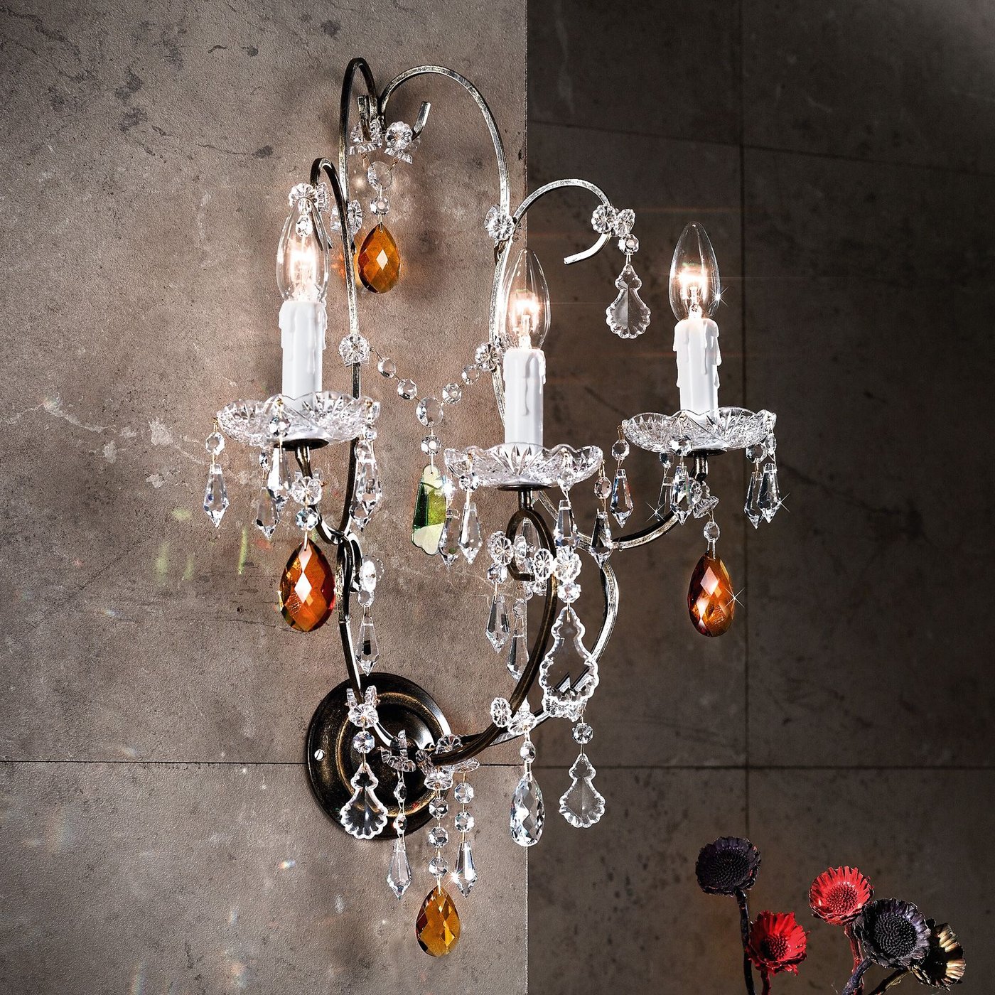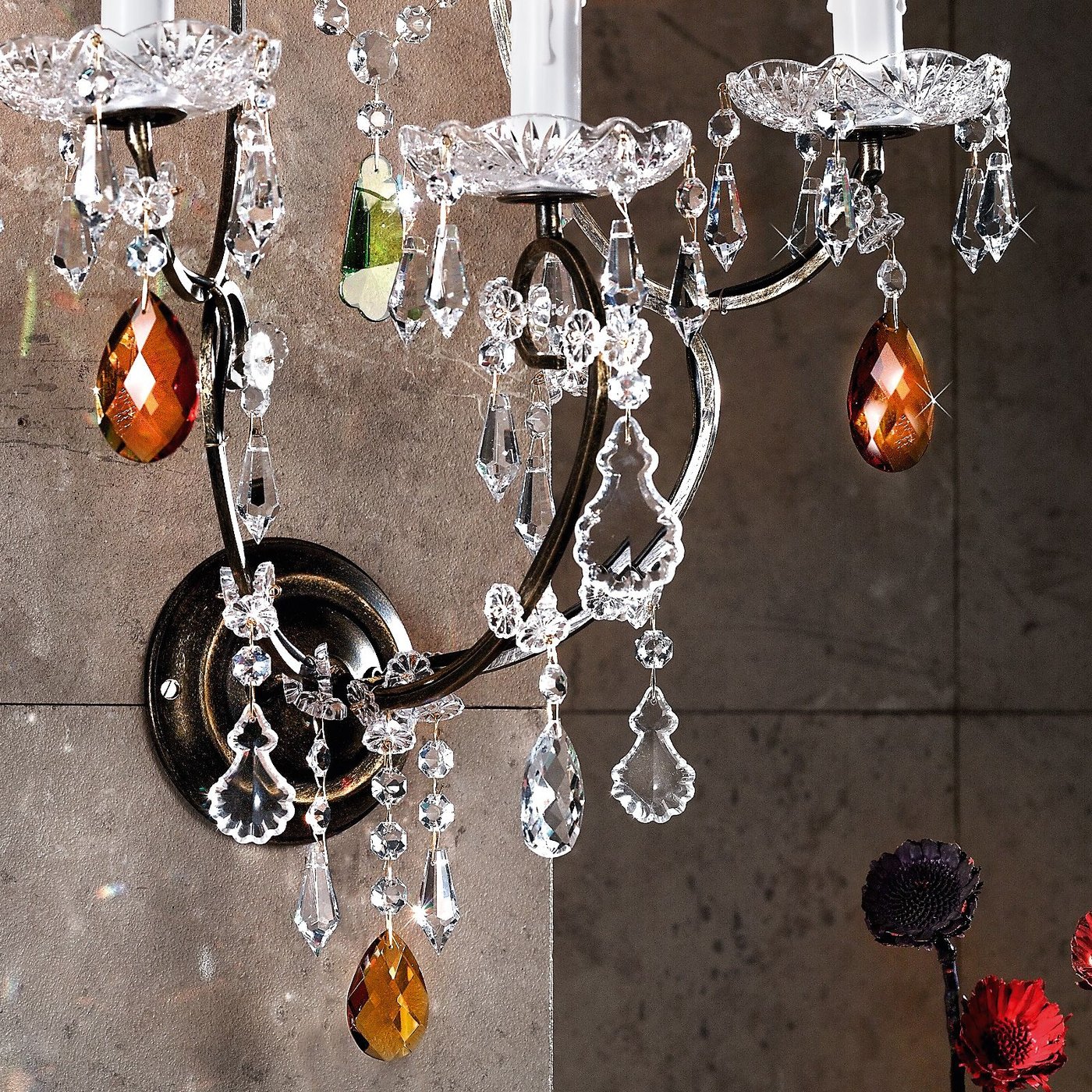 Настенный светильник VERONA отличается романтично-игривым дизайном и может сочетаться с люстрами из одноименной серии, а также может украшать стены как по отдельности, так и группами. Изящно изогнутый каркас с отделкой под старинное золото украшен многочисленными цельногранными кристаллами 1A с различной огранкой. Цветные кристаллы особенно эффектны, придавая светильнику причудливый средиземноморский оттенок. Три цоколя E14 рассчитаны на мощность до 40 Вт и при необходимости регулируются с помощью диммера. Светильник доступен в цветах «старое золото» и «старое серебро».