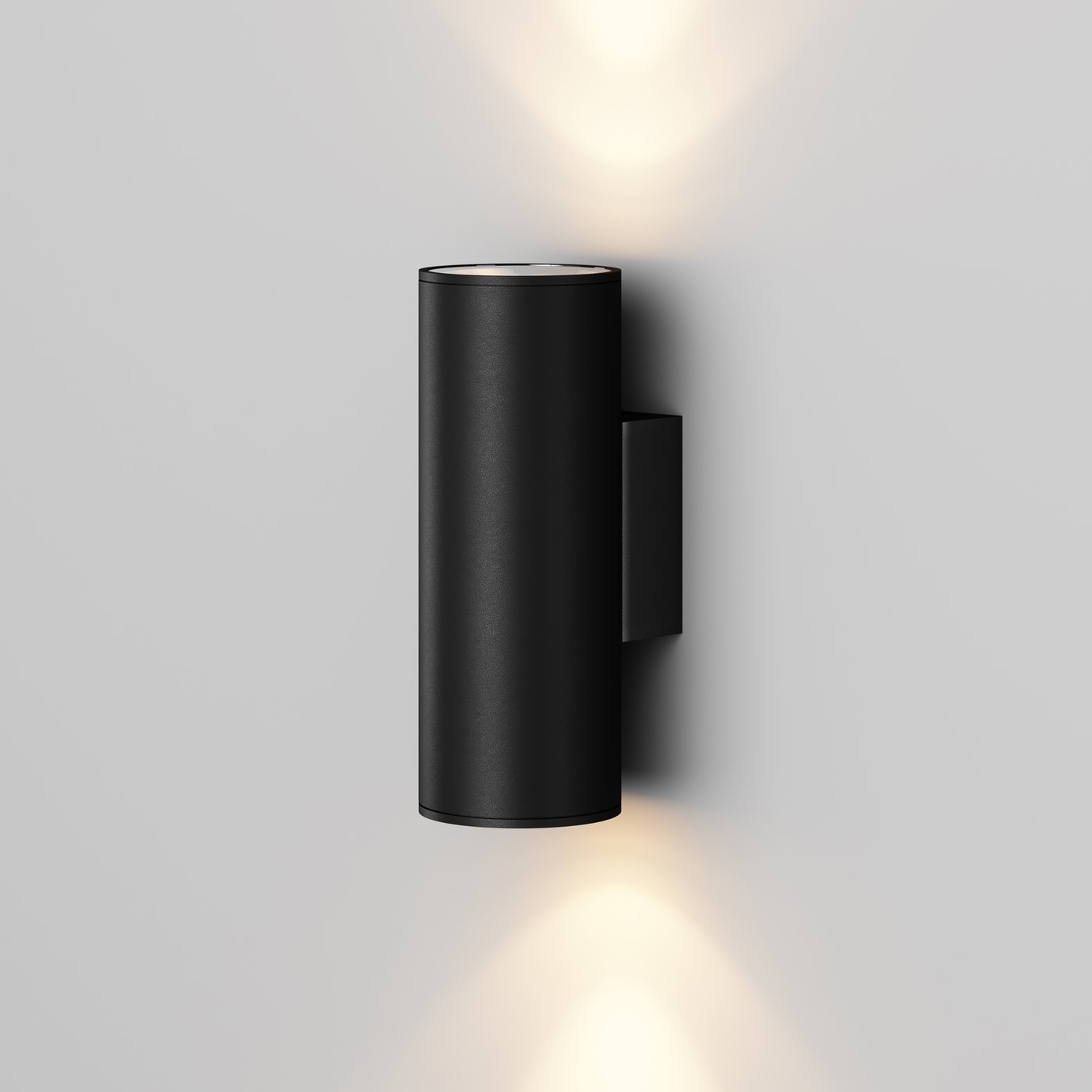 Настенный светильник Maytoni Shim из коллекции Shim выполнен в виде лаконичного цилиндра в графитовом корпусе, который крепится накладным способом и формирует двусторонний световой эффект вверх и вниз. Металлический корпус с защитой IP65 рассчитан на уличное использование, поэтому модель подходит для архитектурной подсветки фасадов, входных групп и террас. При включении два световых пучка расходятся по стене, и если подойти ближе, видно, как луч подчёркивает фактуру кирпича или штукатурки, создавая выразительный вертикальный рисунок. Мощность 24 Вт и световой поток 1700 лм обеспечивают достаточный уровень света для функционального наружного освещения, а угол рассеивания 145° делает пятно широким и равномерным. Тёплая температура 3000 К комфортна для вечерней среды и не искажает цвет отделочных материалов, при этом индекс цветопередачи Ra80 сохраняет естественность оттенков. Конструкция из металла и стекла защищена от пыли и влаги, что обеспечивает стабильную работу в уличных условиях.