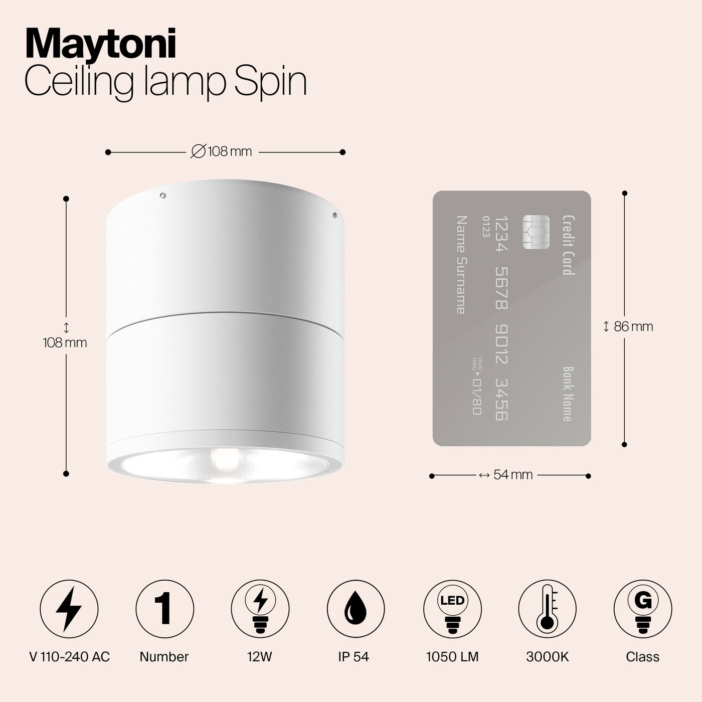 Накладной потолочный светильник из коллекции Spin от Maytoni выполнен в компактном цилиндрическом корпусе диаметром 108 мм с утопленным стеклянным рассеивателем и поворотным световым модулем. Конструкция позволяет разворачивать источник на 360°, направляя поток в нужную сторону: например, выделить зону входа на террасе или подсветить фактуру стены, изменяя акцент простым движением руки. При мощности 12 Вт встроенный LED создаёт световой поток 1050 лм, чего достаточно для локального освещения уличного пространства или как функционального света под навесом. Угол рассеивания 155° даёт широкое покрытие без резких границ светового пятна, а температура 3000K формирует тёплый комфортный свет. Металлический корпус и степень защиты IP54 защищают от влаги и пыли, обеспечивая стабильную работу на открытом воздухе. Индекс цветопередачи Ra 80 сохраняет естественность оттенков отделки и растений в зоне освещения.