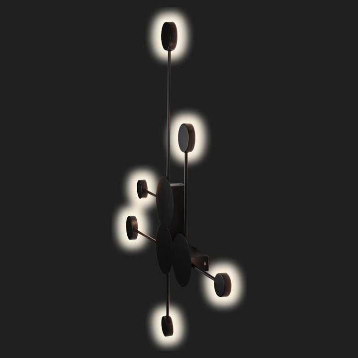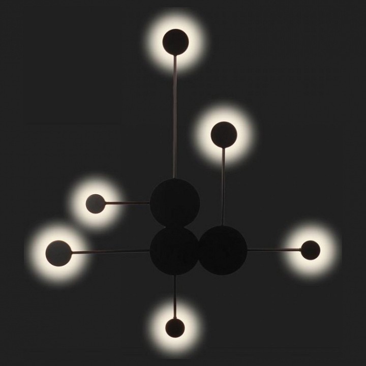Настенный накладной светильник рассчитан на монтаж на поверхность стены и оснащён шестью встроенными светодиодными лампами мощностью 4 Вт каждая с цветовой температурой 3000 K и общим световым потоком 1550 лм. Конструкция выполнена из матового чёрного металла, цилиндрические плафоны направлены вперёд, крепление осуществляется на монтажной пластине. Размеры светильника 970×740×70 мм, общий корпус матовый, стиль техно, площадь освещения до 12 м². Основные признаки — многоплоскостная структура с несколькими точками света, металлические элементы, фиксированное направление плафонов и накладной монтаж, что определяет распределение света и визуальное оформление интерьера.