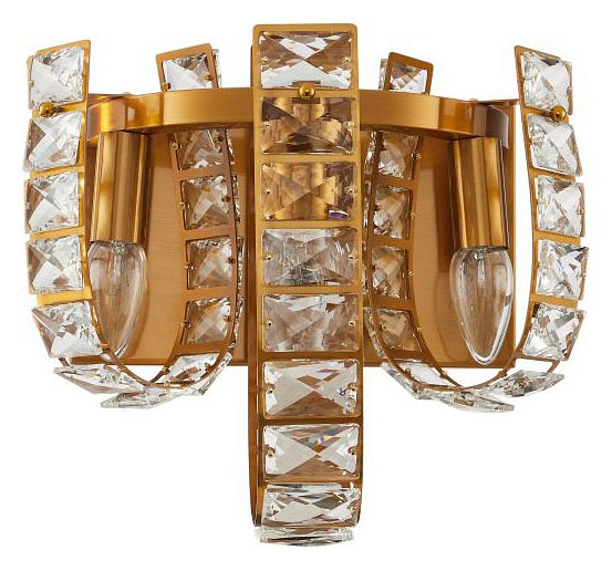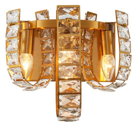 Накладной настенный светильник с декоративной многосоставной конструкцией, рассчитанный на подключение при скрытой проводке. Основа выполнена в бронзовом цвете и включает центральную вертикальную панель, к которой симметрично крепятся изогнутые держатели с установленными лампами. Вокруг них размещены ряды прозрачных гранёных вставок, образующих жёсткий каркас и одновременно работающих как светорассеивающий элемент. Источники света остаются открытыми, что подчёркивает их форму и направление излучения. Указана мощность 40 Вт, производитель Stilfort, коллекция Umiko, артикул 2172/05/03W, изделие относится к декоративным настенным светильникам с выраженной конструктивной детализацией.