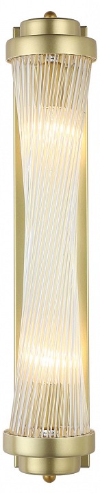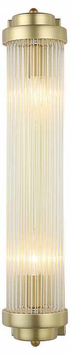 Настенный накладной светильник вытянутой вертикальной формы, предназначенный для установки на поверхность с подводом скрытой проводки. Конструкция состоит из цилиндрического прозрачного стеклянного плафона с выраженной продольной рифлёной текстурой, который зажат между двумя металлическими торцевыми элементами с золотым покрытием. Внутри размещены две лампы с цоколем E14 мощностью до 40 Вт каждая, формирующие свет по всей длине корпуса. Габариты 600×120×150 мм задают заметную высоту и узкий профиль, что важно для размещения на стене в проходных зонах. Крепление осуществляется на монтажной пластине, степень защиты IP20, диммирование возможно при использовании соответствующих ламп.