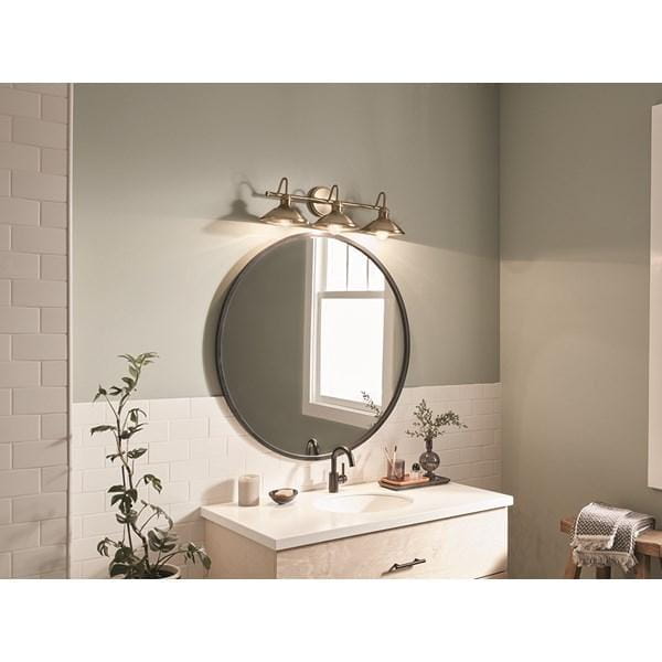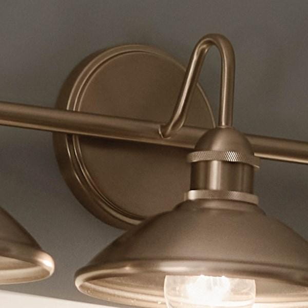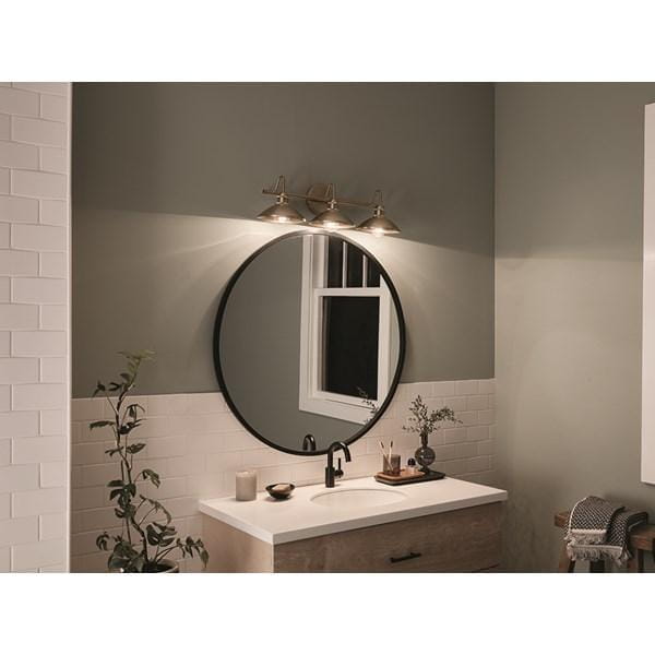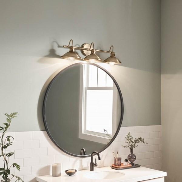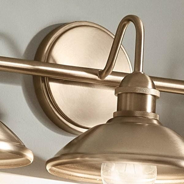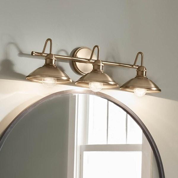 Настенное бра Kichler из коллекции Clyde с тремя лампами выполнено в отделке Champagne Bronze с винтажной розеткой и ромбовидной накаткой на обрамлении, создавая индустриальный и декоративный акцент в интерьере. Модель рассчитана на три источника света диаметром 26,25 дюйма, что позволяет использовать стандартные лампы и обеспечивает удобство замены. Габариты 673 мм и масса 1,7 кг делают светильник устойчивым и удобным для монтажа на стену в ванных комнатах или других помещениях с повышенной влажностью (Damp). Плафоны направляют свет вниз, создавая локальное функциональное освещение для зеркала и рабочей зоны. Модель не оснащена функцией диммирования, что делает её подходящей для базового стандартного освещения. Отделка Champagne Bronze придаёт конструкции выразительность и подчёркивает индустриальный стиль, сочетая практичность с декоративной функцией.