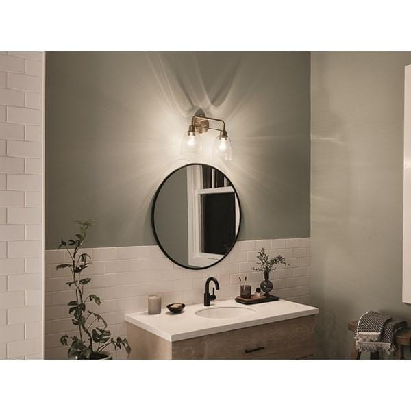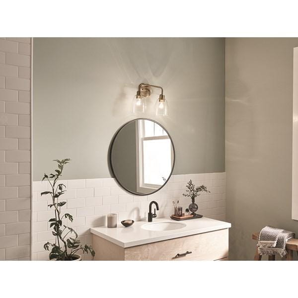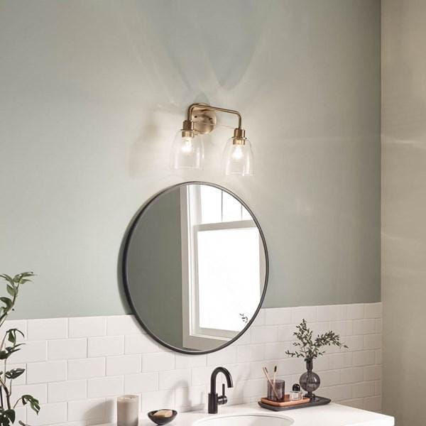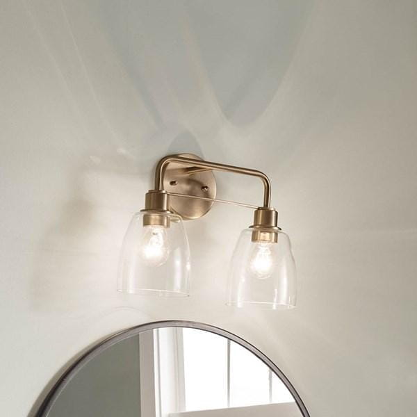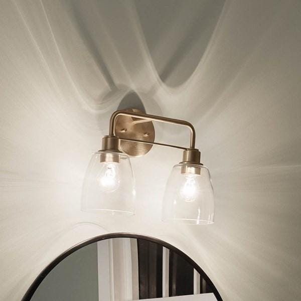 Настенный светильник для туалетного столика из коллекции Meller от Kichler представляет собой модель с двумя лампами, предназначенную для равномерного освещения зеркала и рабочей поверхности. Круглая задняя панель и изогнутые дуги с отделкой Champagne Bronze придают изделию аккуратный и изысканный вид, а прозрачные стеклянные абажуры рассеивают свет и скрывают лампы, смягчая яркость и обеспечивая комфортное освещение рабочей или декоративной зоны. Светильник рассчитан на лампы с напряжением 120 В, что позволяет использовать стандартные источники света с оптимальной яркостью и цветовой температурой. Ширина 387 мм и компактные размеры абажуров 5.35D × 5.75H делают светильник удобным для установки над зеркалом даже в ограниченном пространстве, а масса 0,9 кг облегчает монтаж. Модель предназначена для влажных помещений (Damp), что обеспечивает безопасную эксплуатацию в ванной комнате. Светильник выполняет функцию функционального и декоративного освещения, создавая мягкий, равномерный свет над рабочей зоной.