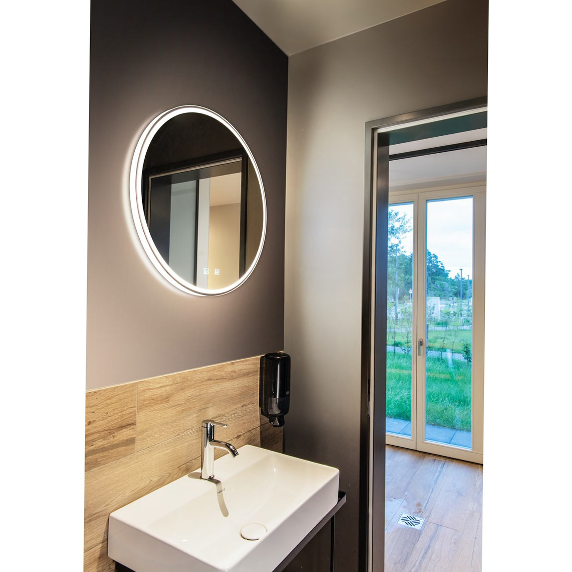 Настенное зеркало из коллекции TRUKKO совмещает зеркальную поверхность и встроенную световую рамку, поэтому работает сразу как функциональный элемент ванной комнаты и как источник фронтальной подсветки. По фото это круглая модель с тонким хромированным контуром, сенсорным управлением на поверхности и небольшой глубиной, что важно для компактного настенного размещения. В описании акцент сделан на рабочих параметрах: встроенный LED мощностью 25 Вт, три варианта цветовой температуры 3000, 4000 или 6500 K, световой поток 1270, 1260 или 1260 лм, степень защиты IP44 и ресурс 50 000 часов. Отдельно указана функция защиты от запотевания, что для зеркала в ванной важнее декоративных деталей.