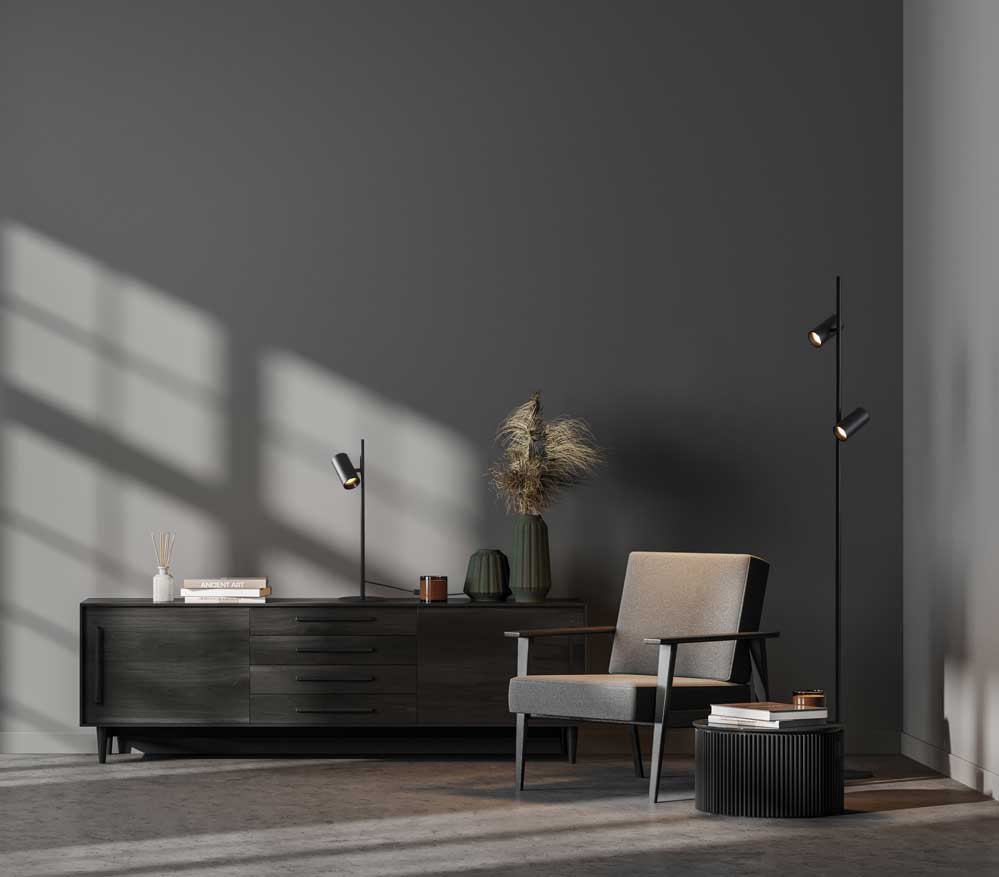 Настольный светильник Gina воспринимается как функциональный и точный инструмент освещения: тонкий чёрный стержень и два регулируемых цилиндрических корпуса создают ощущение минимализма и технологичности. Когда берёшь его в руки или поворачиваешь рычаги, световые головки мгновенно меняют направление, позволяя точно нацелить луч на рабочую поверхность или объект, фиксируя выбранную зону. Он работает как концентрированный источник света для чтения или выделения деталей интерьера, при этом движение руки над рычагами интуитивно регулирует угол и интенсивность. Металлическая конструкция обеспечивает устойчивость и долговечность, а компактное основание диаметром 160 мм удерживает лампу в нужной позиции без риска падения. LED-источники дают яркое, энергосберегающее освещение, а черный цвет корпуса делает прибор незаметным на фоне стола, выделяя только направленный световой пучок.