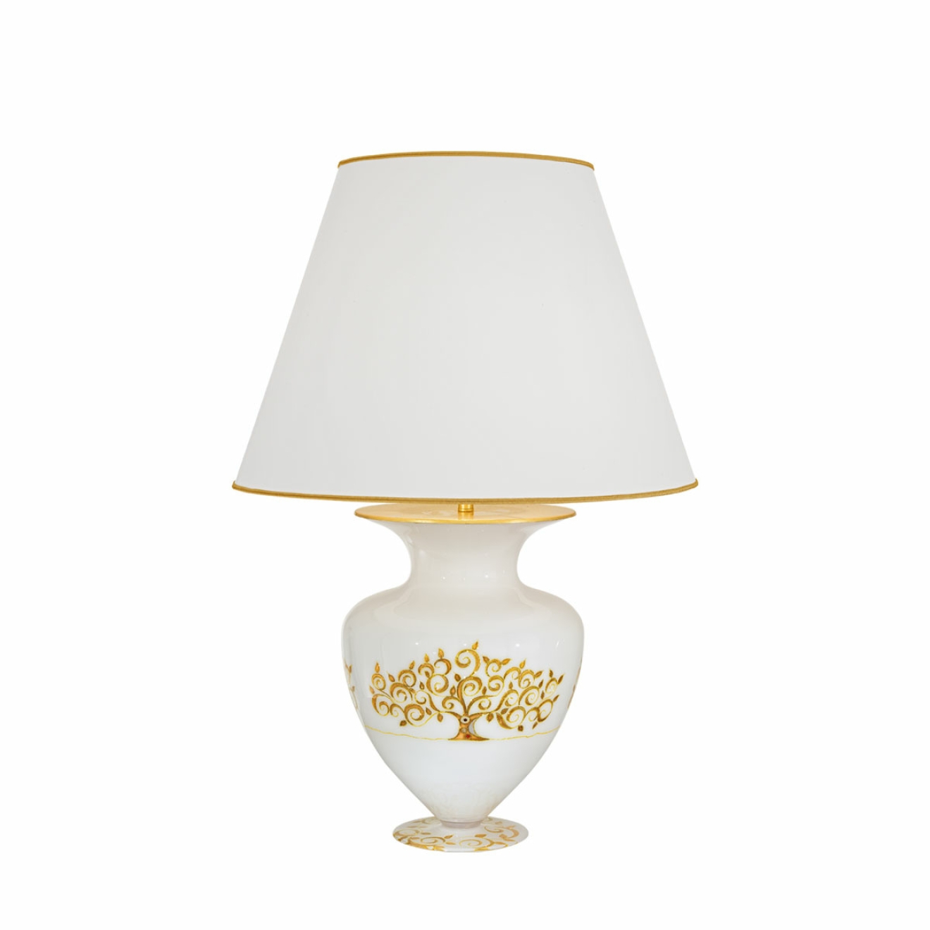 Our wonderful ANFORA table lights are inspired by antique amphoras. A design of timeless beauty meets hand-painted decors with love for detail. Fanciful eye-catchers in any room, showing a splendid flow of colours and shapes. Decor ALBERO GOLD.