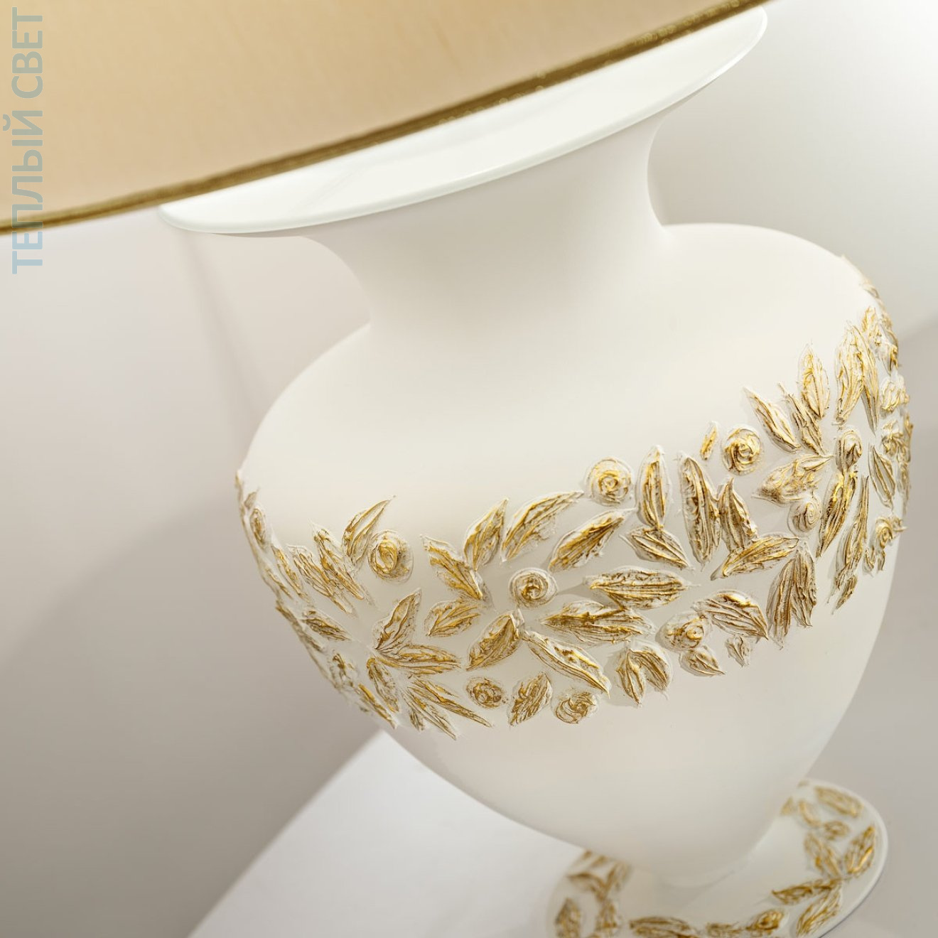 Настольная лампа с классической формой, основанной на фигурном корпусе в виде вазы и текстильном абажуре конического типа. Основание выполнено в белом цвете с декоративным рельефным орнаментом в виде растительных мотивов с золотистой отделкой, размещённым по центральной части. Абажур из светлой ткани имеет мягко расширяющуюся форму и дополнен тонкой окантовкой по краям. Высота изделия составляет 65 см при диаметре 45 см, используется одна лампа с цоколем E27. Конструкция предназначена для установки на столах или тумбах и сочетает декоративное основание с рассеиванием света через тканевый абажур.
