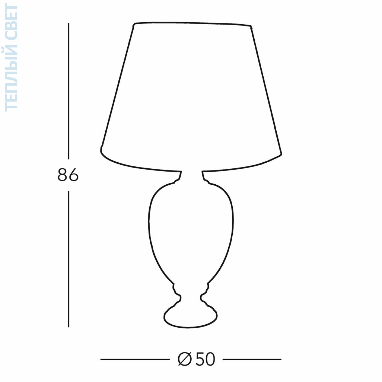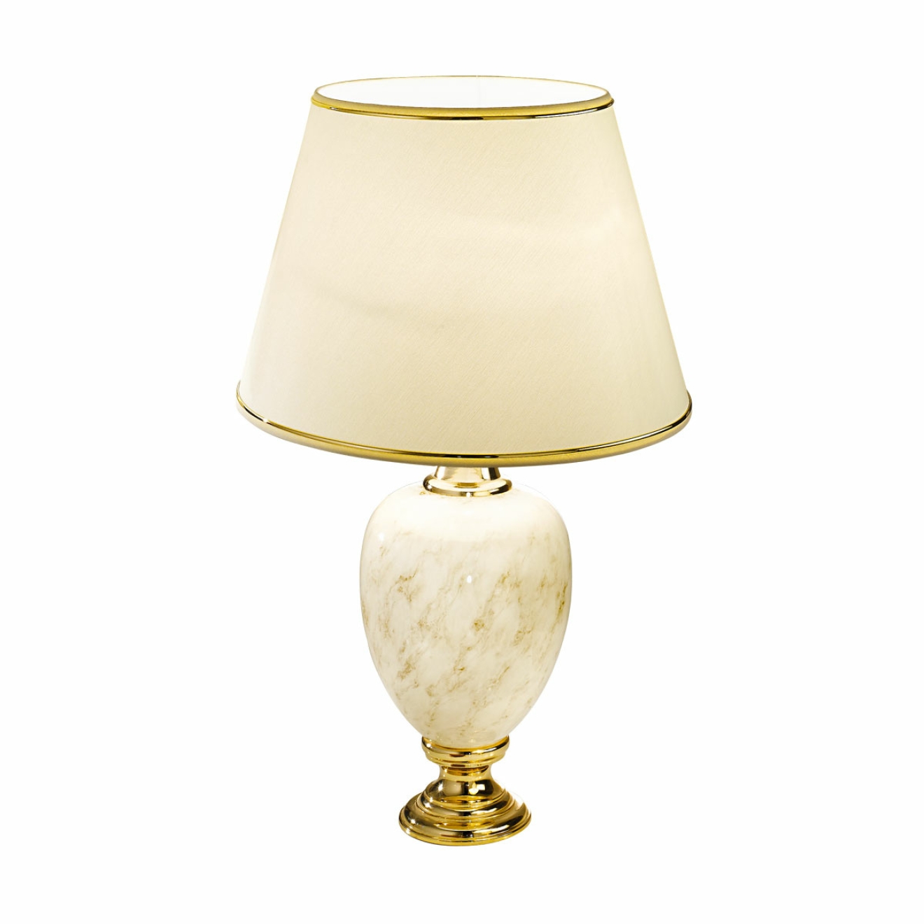 Настольная лампа предназначена для использования в жилых помещениях, таких как гостиные, столовые или спальни, и обеспечивает локальное рассеянное освещение. Она состоит из керамической базы светлого оттенка с декоративной металлической отделкой и тканевого абажура в конусообразной форме с золотистым кантом. Светильник рассчитан на одну лампу с цоколем E27, высота конструкции 86 см, диаметр абажура 50 см. Абажур рассеивает свет равномерно, создавая мягкое освещение зоны вокруг лампы, а конструкция стационарная, с установкой на горизонтальную поверхность, кабель подключается к стандартной розетке.