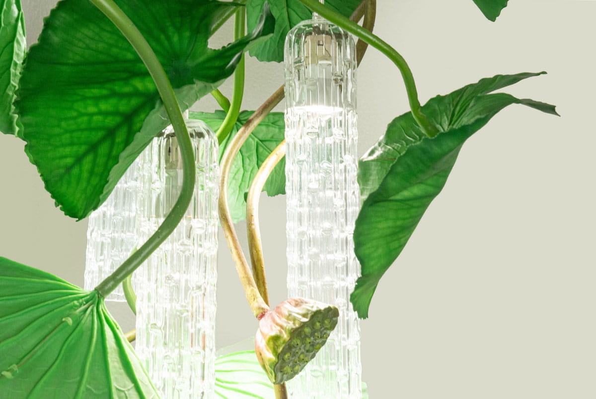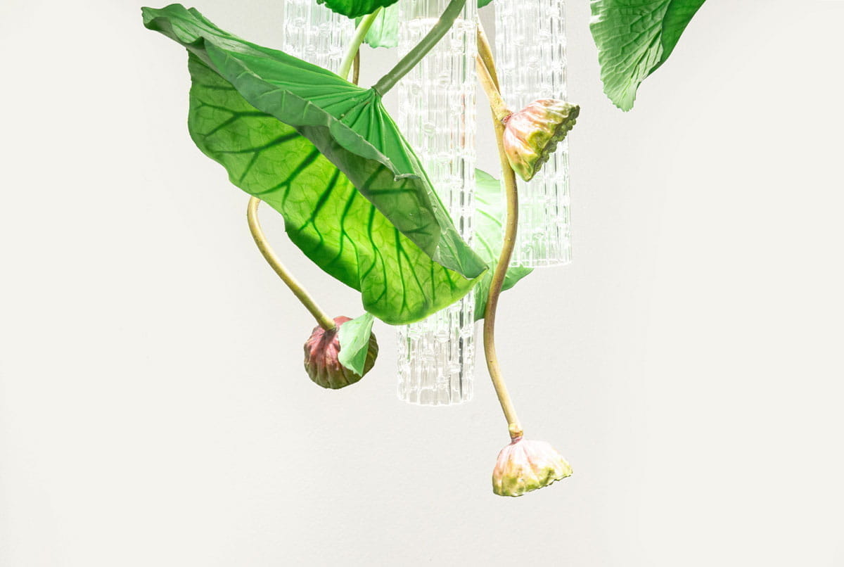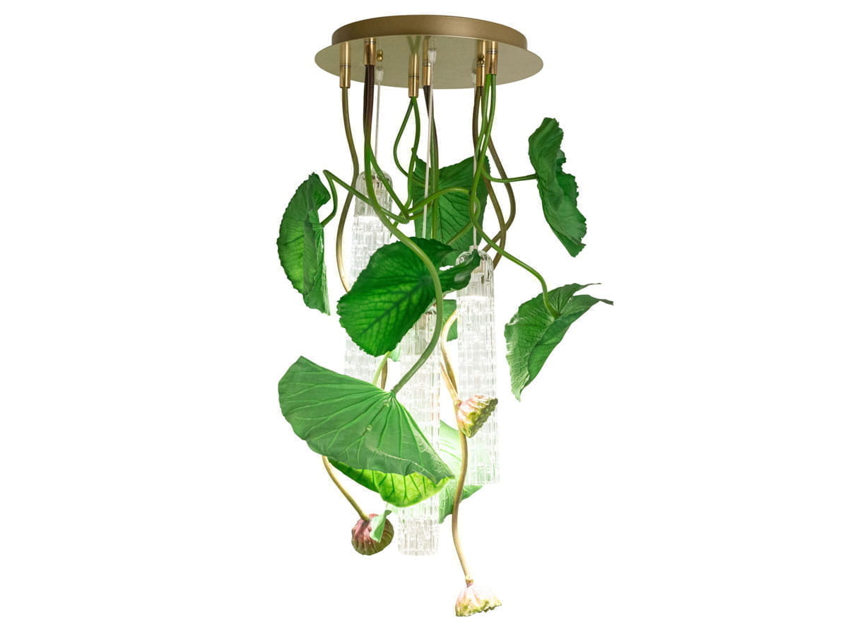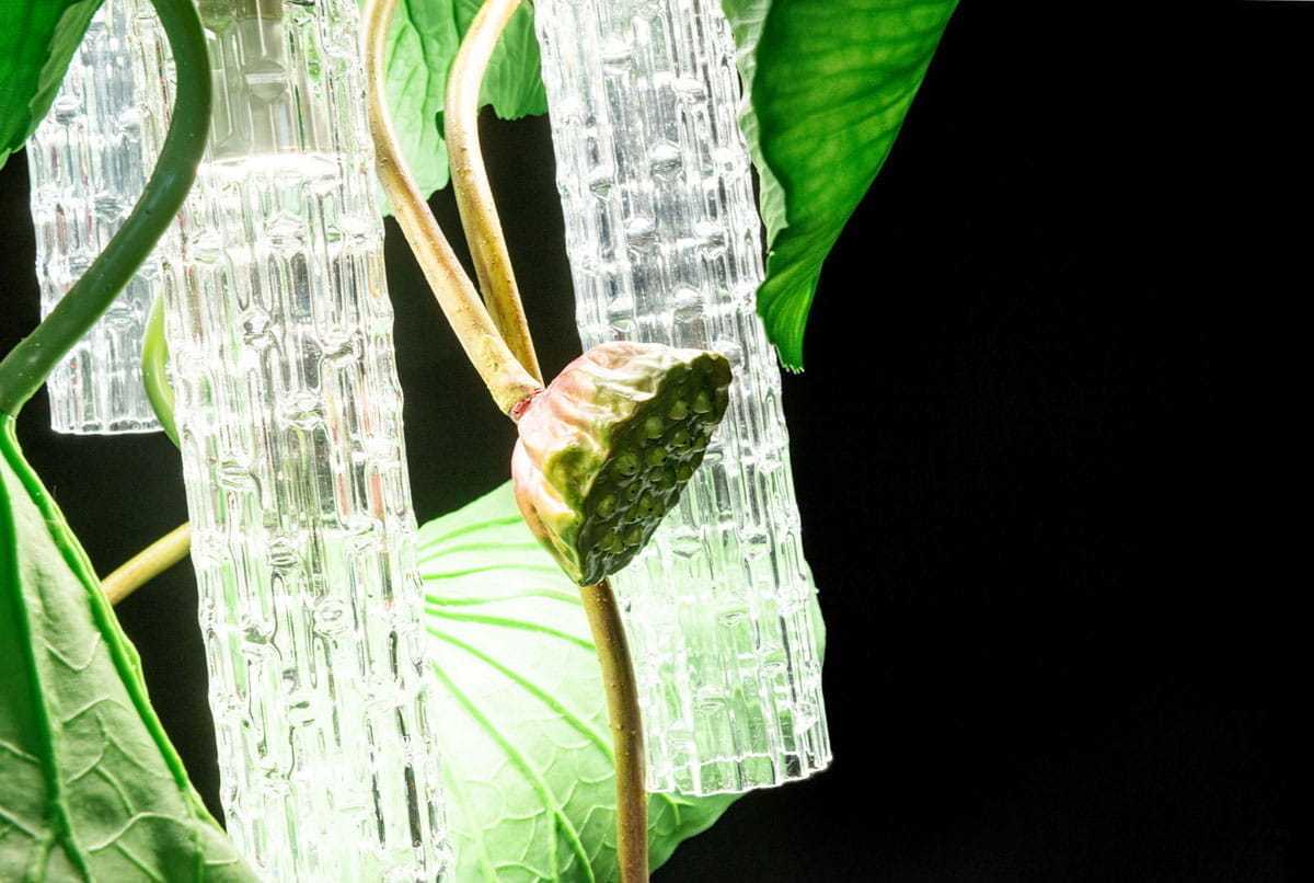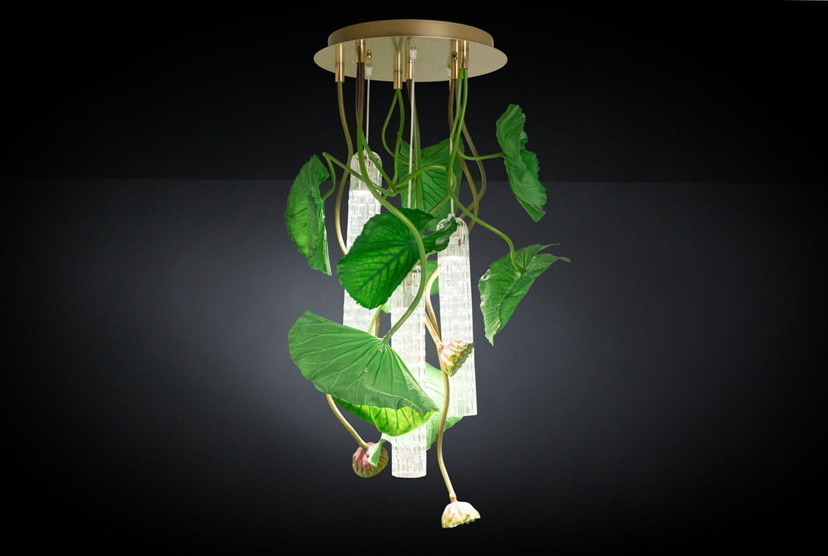 Таким образом, очарование флоры путешествовало по временам года, интерпретируя этот элемент освещения с цветами лотоса и фаленопсиса, с плющом и маками.