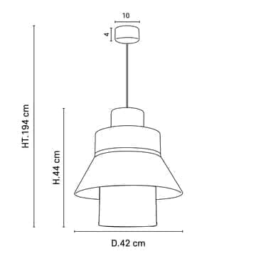 Подвесной светильник включает четыре лампы с тканевым покрытием и спицы, формирующие многослойный плафон с внутренней цилиндрической частью из переплетённого материала и внешней усечённой конусной оболочкой. Подвес снабжён текстильным шнуром и адаптируемым металлическим DCL-павильоном для потолочного монтажа. На интерьерной фотографии видно, что светильник размещается над столовой поверхностью, создавая направленное освещение. Чертёж уточняет общую высоту и диаметр плафона, позволяя оценить масштаб и размещение изделия. Верхняя секция плафона выделена розовым цветом, а конусная оболочка выполнена в светло-зелёном оттенке, что визуально дифференцирует слои конструкции.