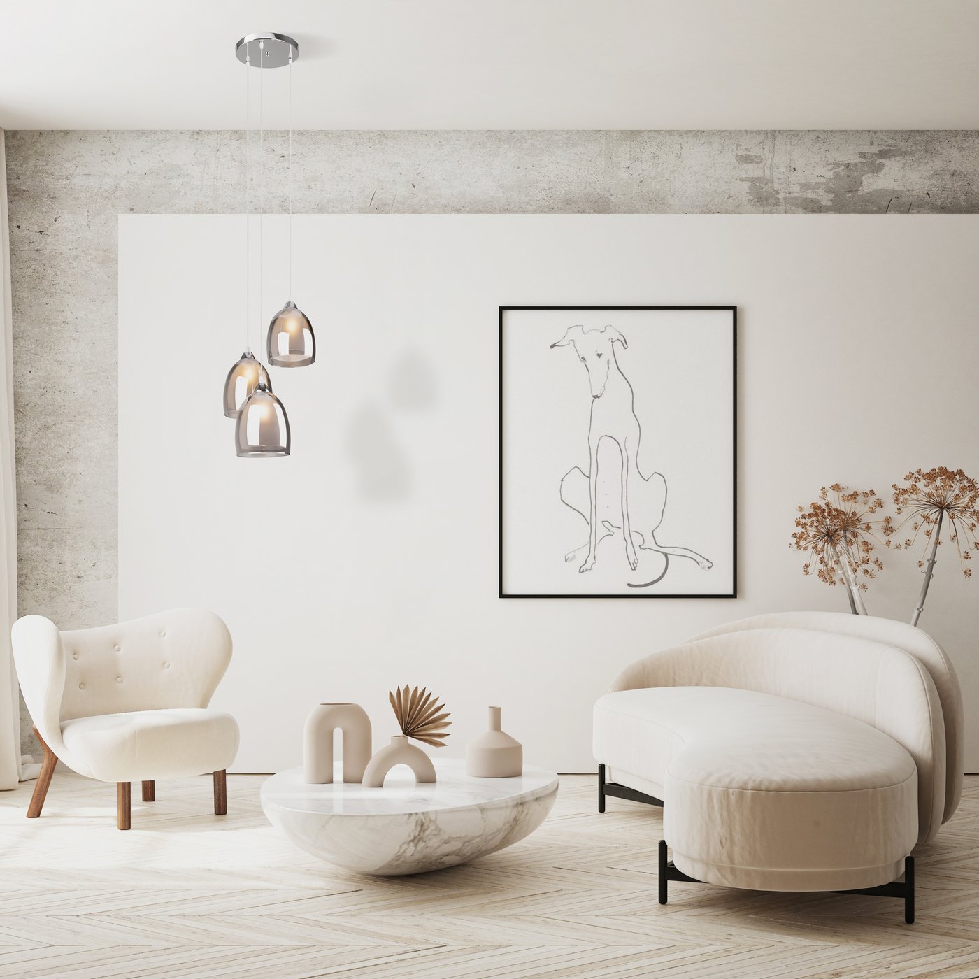 Арматура из металла в цвете хром. Двойные стеклянные плафоны в 3-х оттенках: дымчатый, коньячный, прозрачный. Компактные светильники-каскады в 2-х комбинациях — с одним плафоном и тремя. Высота тросов регулируется. Источник света — лампа с цоколем Е27