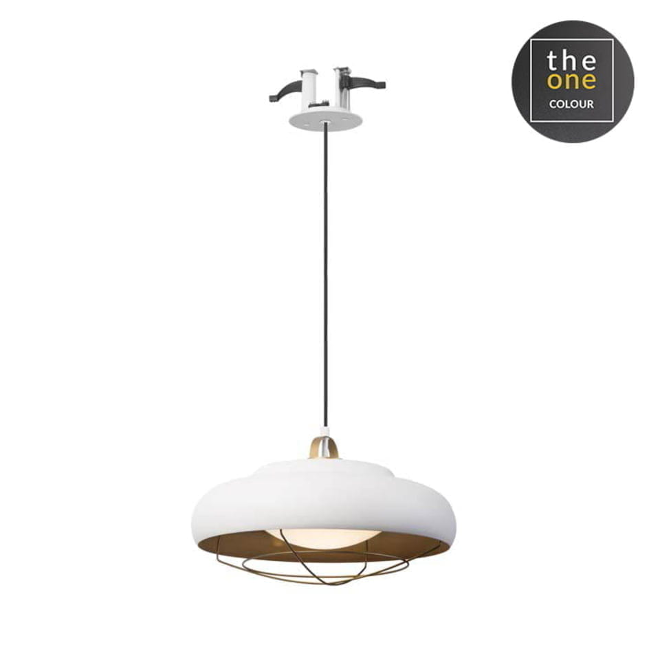 подвесной светильник с округлым плафоном белого цвета и металлическим ободом