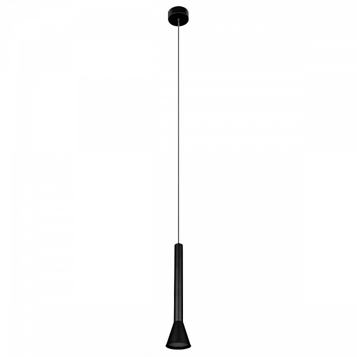 Подвесной светильник рассчитан на потолочное размещение и состоит из цилиндрического металлического корпуса с черной матовой отделкой и усечённым конусообразным плафоном, направленным вниз. Встроенный светодиод мощностью 7 Вт с цветовой температурой 4000 K и световым потоком 630 лм обеспечивает локальное освещение рабочей или столовой зоны. Размеры светильника составляют 50 мм в диаметре и 250 мм в высоту, что делает его компактным и подходящим для установки над столом или барной стойкой. Скриншоты показывают размещение в интерьере кухни, обеспечивая направленный свет на небольшую площадь около 3,5 м².