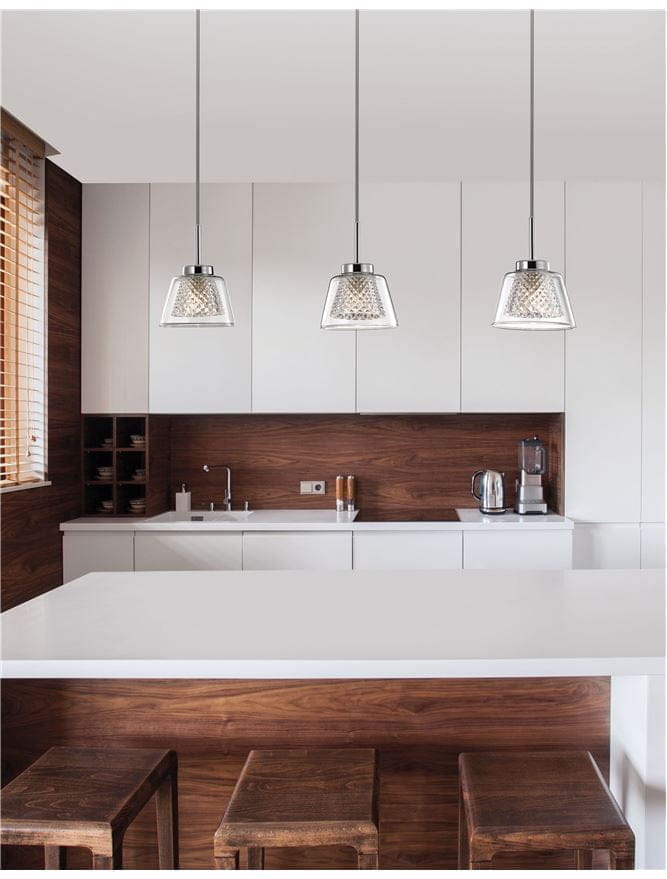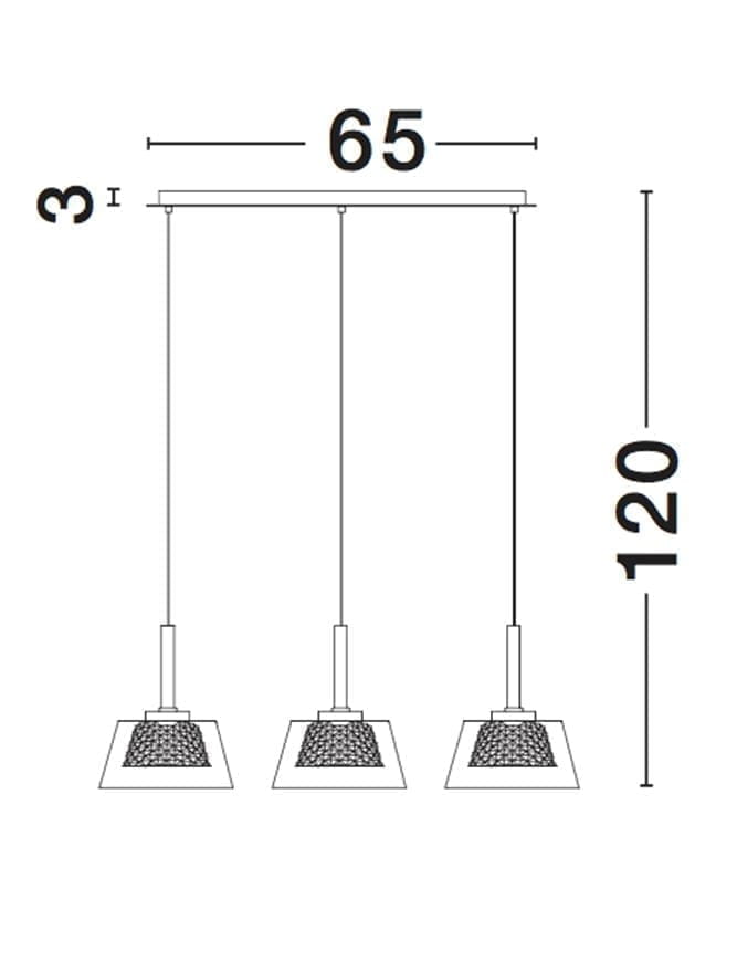 Подвесной светильник линейной компоновки с тремя отдельными плафонами, закрепленными на прямоугольном потолочном основании и опущенными на шнурах на одну линию. По фото применения модель рассчитана прежде всего на размещение над столом или рабочей поверхностью, где важна вытянутая форма светильника и разнесение источников света по длине. Арматура выполнена из хромированного алюминия, плафоны — из прозрачного стекла, через которое хорошо читается внутренняя структура каждого элемента. В карточке указан цоколь G9 и схема 3x33 Watt 230 Volt, при этом лампы включены в комплект. Степень защиты IP20 указывает на использование в сухих помещениях. Размеры светильника составляют 65 см в длину, 10 см в ширину и 120 см по высоте. Производитель Nova Luce, коллекция Boccale, артикул 1300301303.