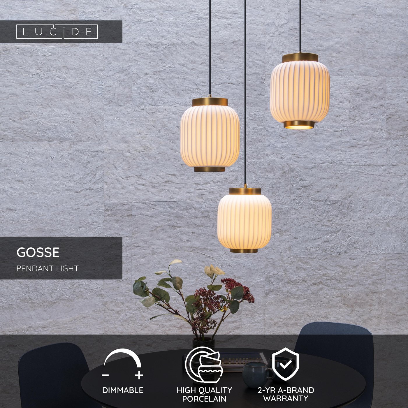 Подвесной светильник состоит из трёх цилиндрических фарфоровых плафонов цвета айвори, закреплённых на одной металлической планке, общая длина конструкции 156 см, ширина 55 см, высота 155,8 см. Каждая лампа с цоколем E27 рассчитана на мощность до 40 Вт, лампы в комплект не входят. Кабель длиной 130 см позволяет подвесить светильник на нужной высоте, диммирование поддерживается. Конструкция обеспечивает рассеянное освещение вокруг, потолочная чаша размером 40×40×2,5 см, масса изделия 5,5 кг. Модель выполнена в стиле japandi, материал плафонов и арматуры — фарфор, класс электробезопасности II, степень защиты IP20. Производитель Lucide, коллекция GOSSE.