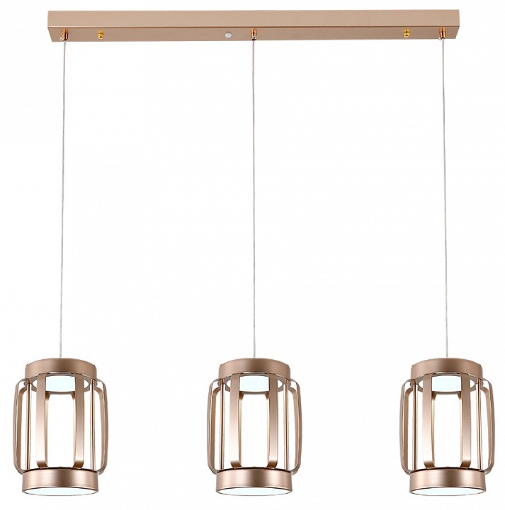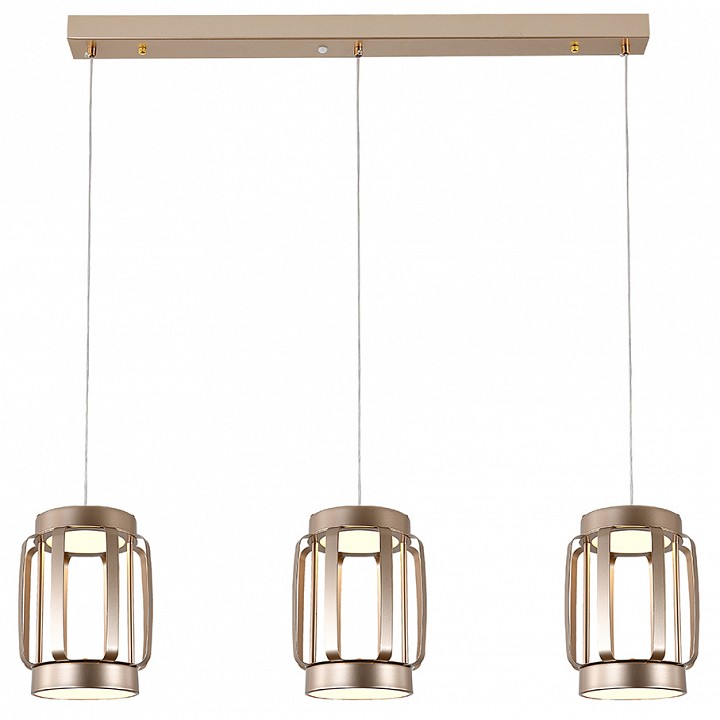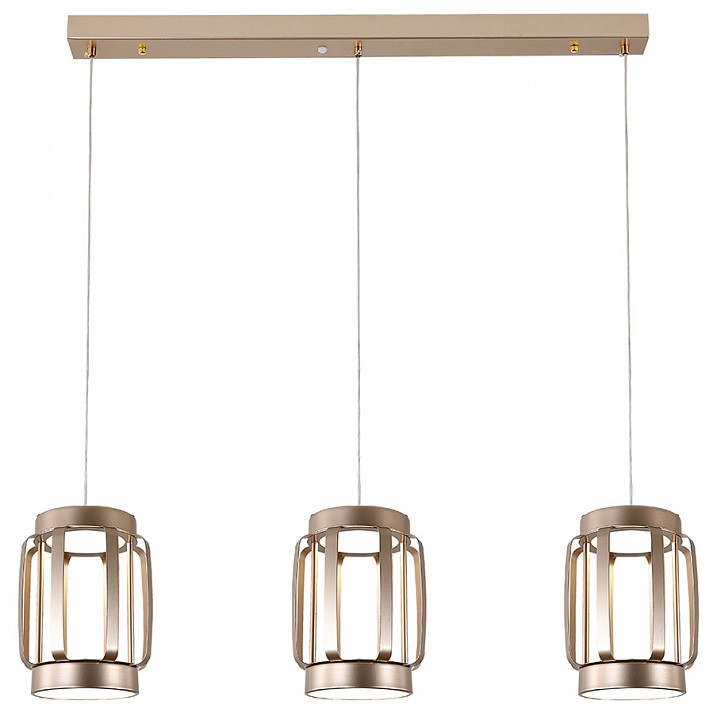 Подвесной светильник линейного типа с тремя независимыми световыми модулями, закреплёнными на прямоугольной потолочной планке и подвешенными на тросах. Каждый модуль выполнен в виде цилиндрического корпуса с открытым каркасом и внутренним акриловым рассеивателем, через который направлен свет вниз. Конструкция рассчитана на встроенные светодиодные источники общей мощностью 70 Вт с возможностью диммирования и регулировкой цветовой температуры в диапазоне 3000–6000 K, обеспечивая световой поток до 5120 лм. Габариты 886×160 мм при общей высоте до 1500 мм задают вытянутую форму, подходящую для размещения над столами или рабочими зонами. Корпус выполнен из металла с глянцевой золотой отделкой.