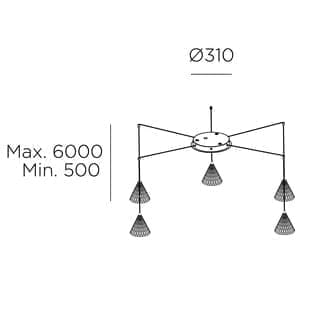 Подвесной светильник с центральным потолочным основанием диаметром 310 мм и пятью независимыми подвесами, каждый из которых завершён конусным рассеивателем. Плафоны выполнены из метакрилата с пескоструйной обработкой и формируют направленный вниз свет, внутри интегрированы светодиодные модули. Высота подвесов регулируется в диапазоне от 500 до 6000 мм, что позволяет распределять элементы на разной отметке. Конструкция рассчитана на внутреннее использование и выполнена из алюминия и стали в чёрной отделке. Общая мощность около 26,9 Вт, цветовая температура 2700K, предусмотрено диммирование по протоколу 0–10 В.