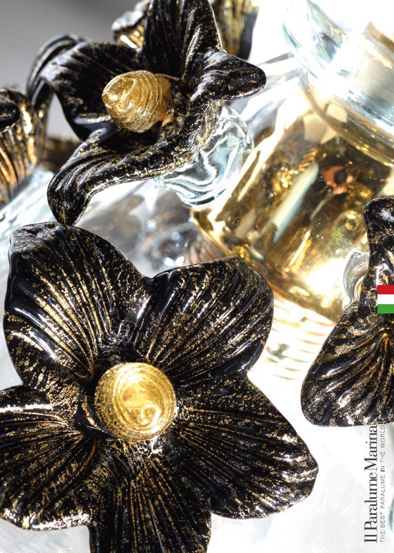 Подвесной светильник из стекла с цветами из муранского стекла чёрного и золотого цветов. Этот светильник эффектно рассеивает свет, создавая тёплую и уютную атмосферу.
