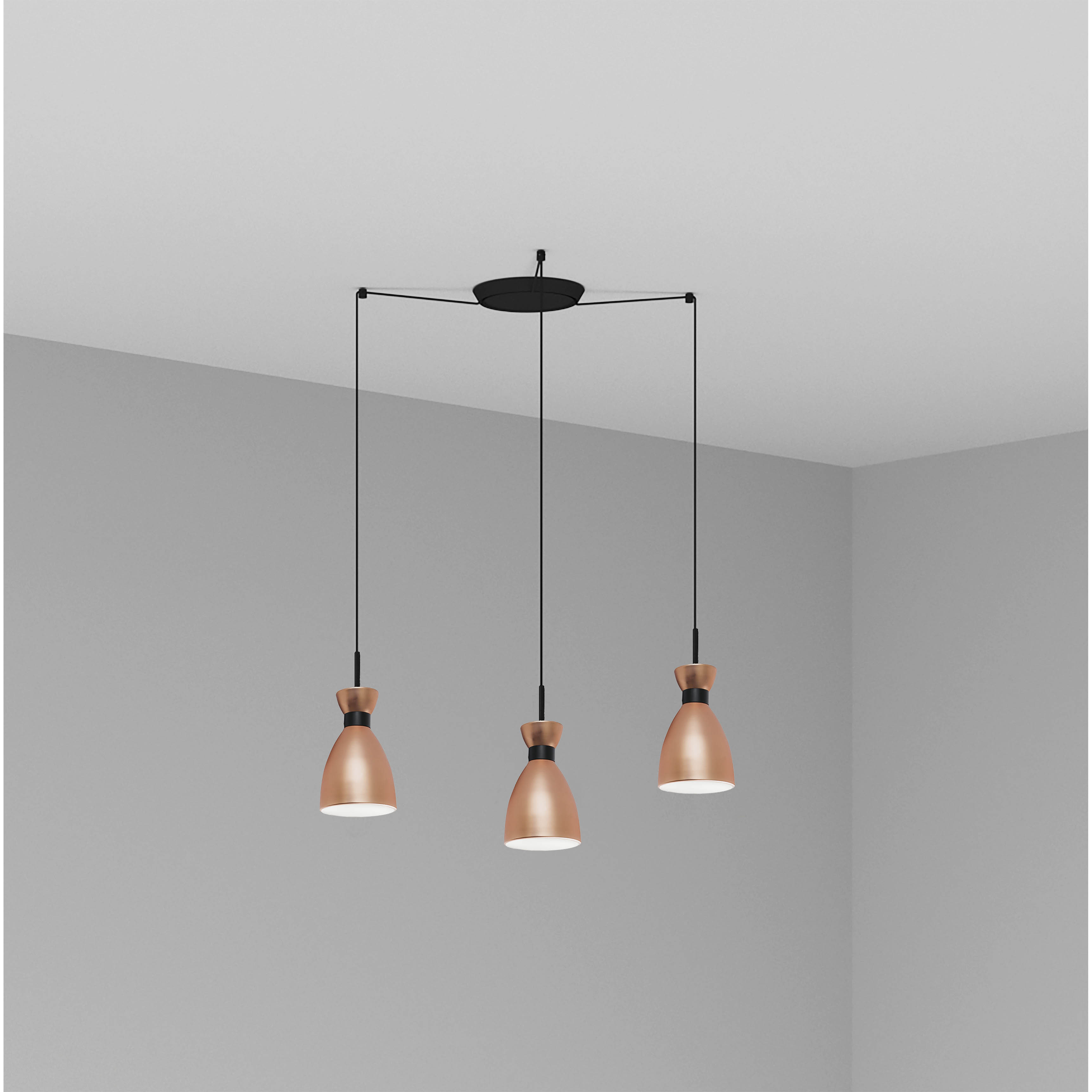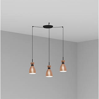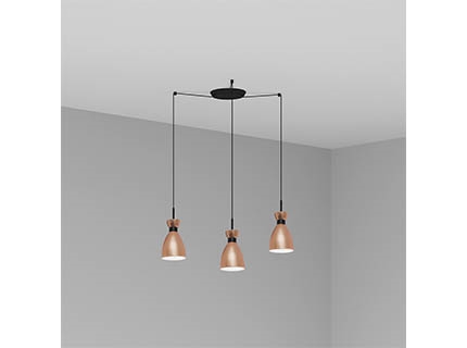 Подвесной светильник с тремя коническими плафонами формирует направленный поток света вниз и равномерно распределяет его над столом или барной стойкой. В коллекции RETRO от Faro Barcelona каждая модель выполнена в матовой меди, поэтому свет отражается от внутренней поверхности плафонов и создаёт чёткие световые пятна без лишнего рассеивания. Три независимых подвеса позволяют визуально выстроить композицию и осветить вытянутую поверхность как единый рабочий контур. При выборе высоты до 1740 мм светильник можно опустить на комфортный уровень, чтобы поток концентрировался на столешнице, а не слепил сидящих. Патроны E14 рассчитаны на LED-лампы до 8 Вт каждая, что даёт возможность подобрать температуру и интенсивность под конкретный сценарий локального освещения. Степень защиты IP20 рассчитана на установку в сухих жилых помещениях.
