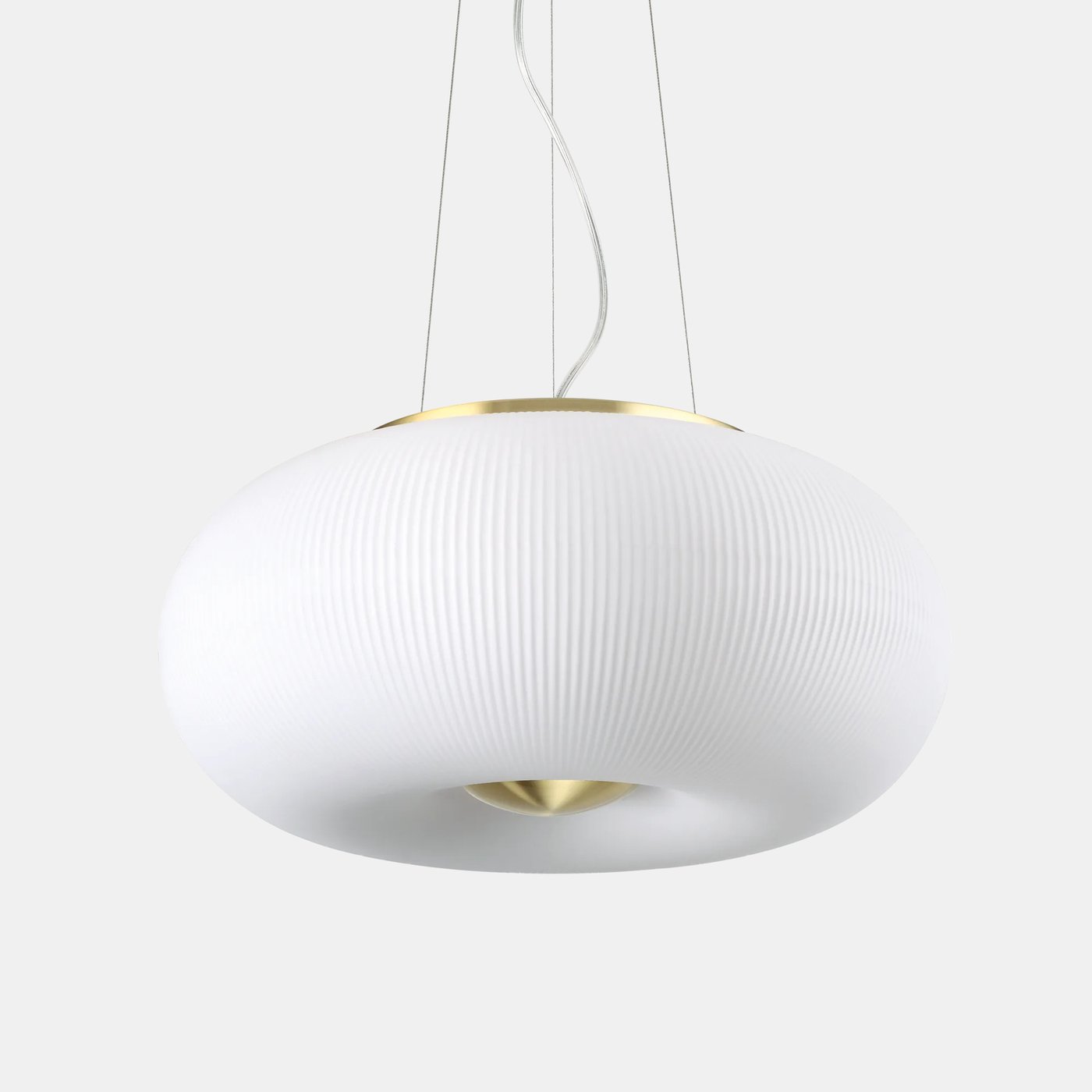 Подвесной светильник Ideal Lux ARIZONA SP3 из коллекции Arizona сочетает в себе элегантный металлический каркас с отделкой под матовую латунь и белый рассеиватель из дутостекла с легким тиснением. Декоративные полосы на поверхности стекла создают интересные световые акценты, при этом мягко рассеивая свет по комнате. Этот светильник идеально подходит для создания общего освещения в гостиной или столовой, а его строгая и лаконичная форма делает его универсальным решением для разных интерьеров. Модель комплектуется лампой и оснащена защитой от пыли и влаги IP20, что позволяет использовать её в помещениях с нормальной влажностью. Оптимальная яркость и равномерное освещение создаются за счет твердого рассеивателя, который обеспечивает комфортную атмосферу.