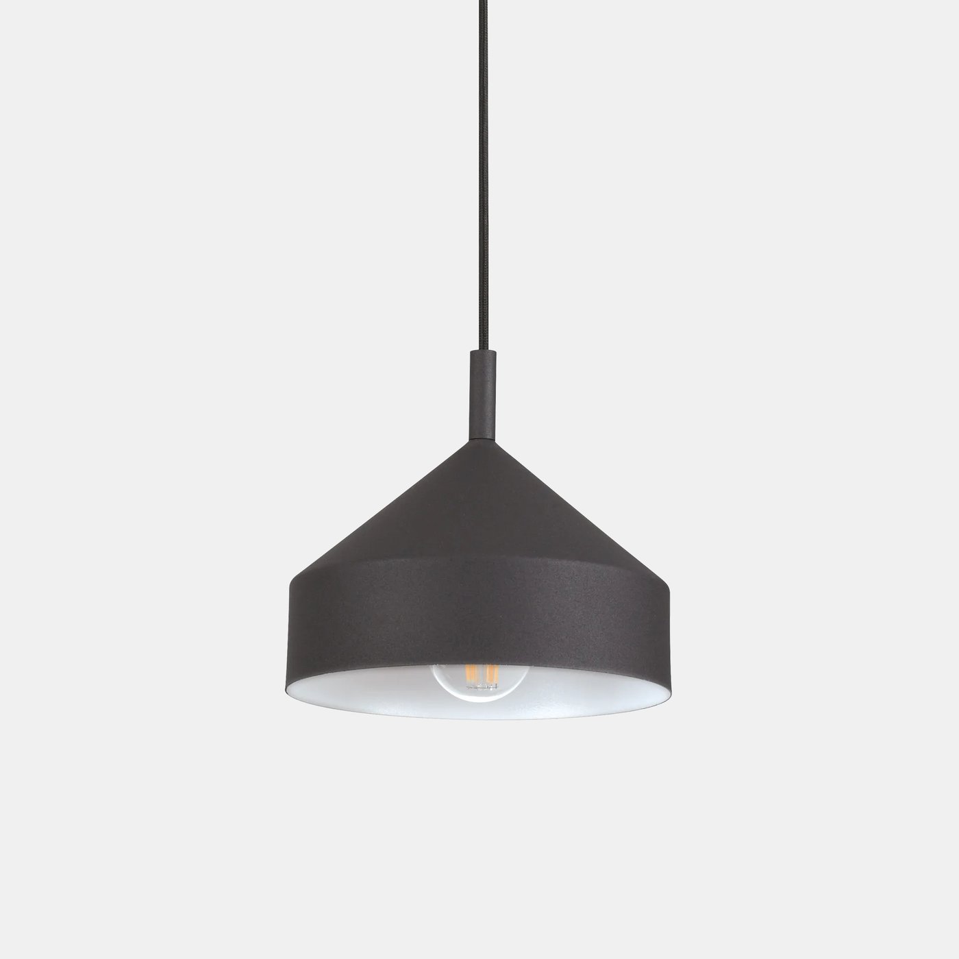 Потолочная розетка и абажур из металла с порошковым покрытием. Кабели в тканевой оплетке. Цвета: полностью белый или черный с белой внутренней отделкой.