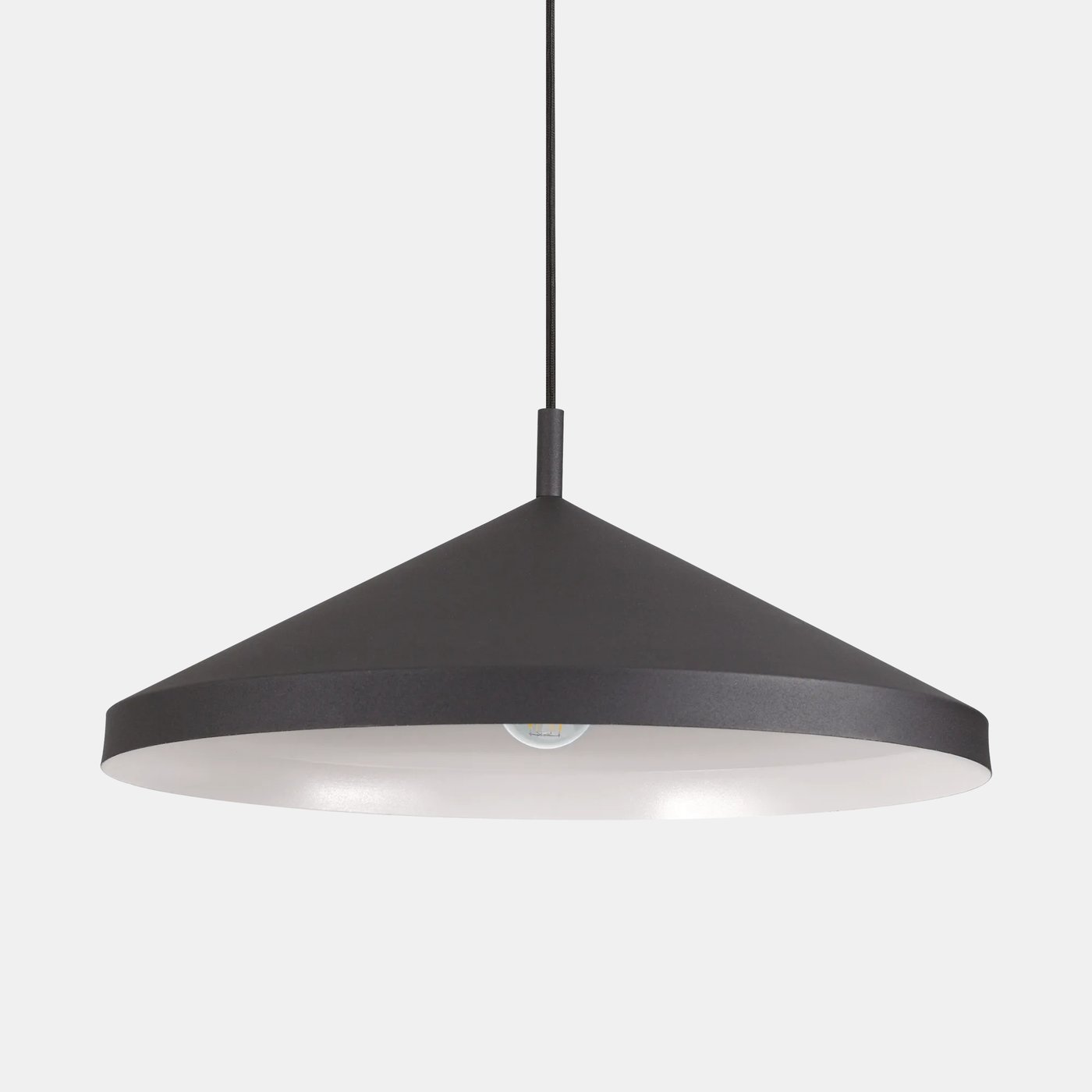 Потолочная розетка и абажур из металла с порошковым покрытием. Кабели в тканевой оплетке. Цвета: полностью белый или черный с белой внутренней отделкой.