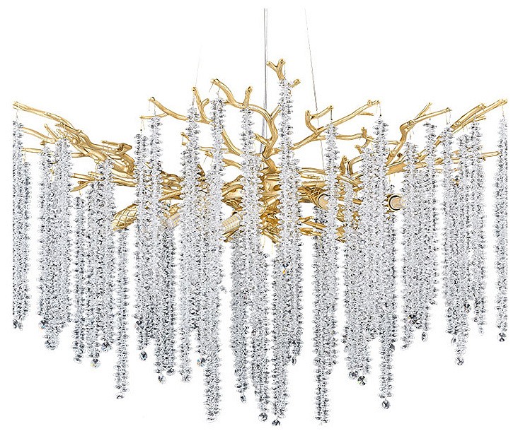 подвесная люстра с золотым каркасом и каскадными хрустальными подвесками