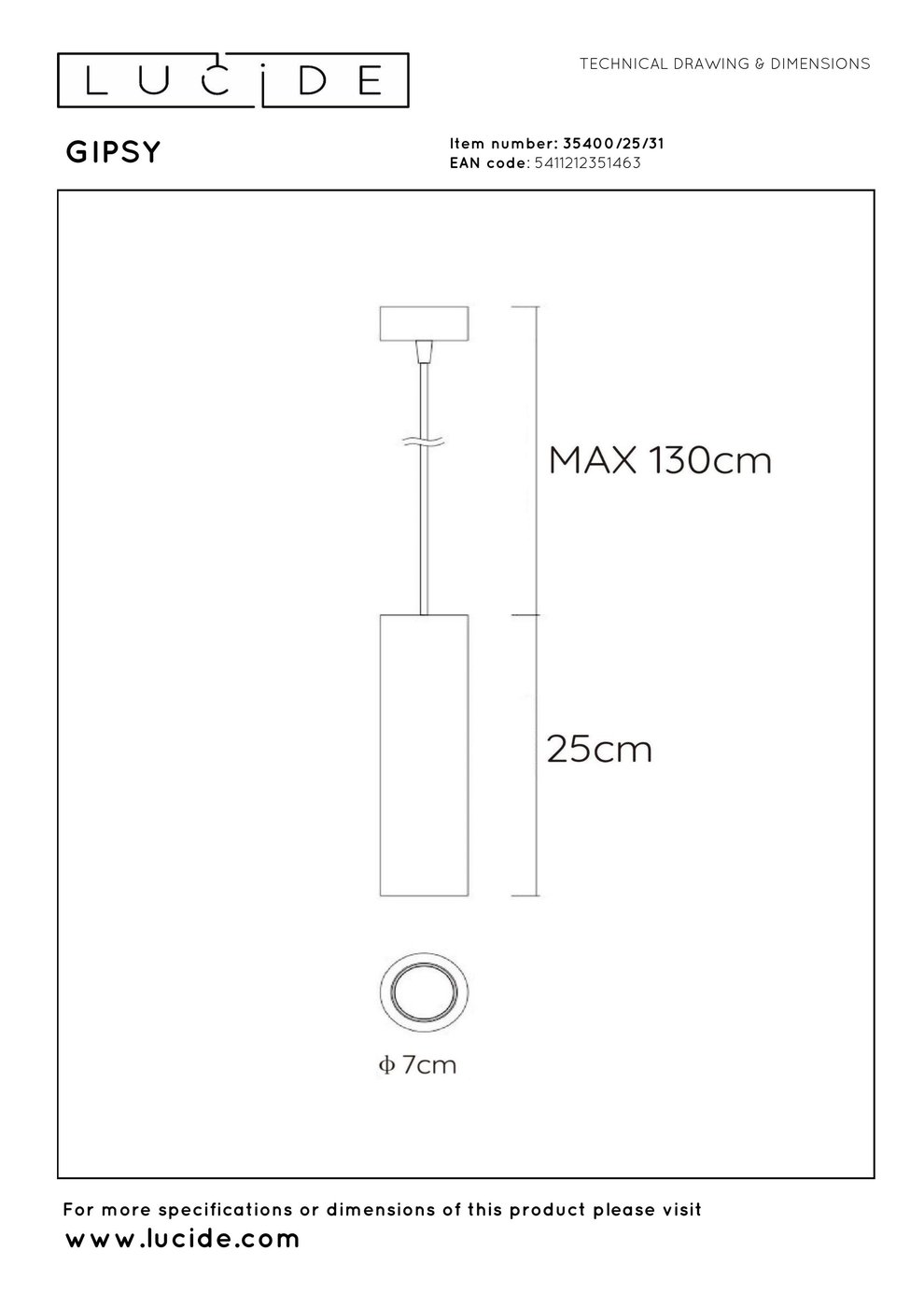 35400/25/31 Lucide Gipsy подвесной светильник цилиндрической формы с одним плафоном