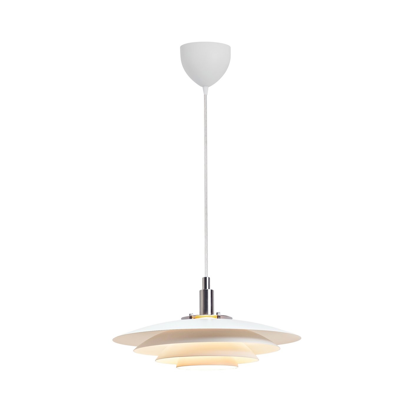 Подвесной светильник с многослойным металлическим абажуром формирует мягкий направленный вниз поток и одновременно рассеивает часть света в стороны через зазоры между уровнями. В серии Nordlux Bretagne плафон диаметром 38 см собран из нескольких дисков, окрашенных в белый цвет с внутренней стороны, что усиливает отражение и делает освещение более равномерным. Модель работает как основной свет над обеденным столом: когда человек садится за стол, свет концентрируется на поверхности, а благодаря перекрывающимся слоям источник не виден под прямым углом и не слепит. Цоколь G9 рассчитан на лампу общей мощностью до 25 Вт, позволяя подобрать нужную температуру и яркость под конкретный интерьер; при использовании диммируемой лампы можно регулировать интенсивность. Кабель длиной 2 метра даёт возможность точно выставить высоту подвеса относительно столешницы. Степень защиты IP20 и класс II предполагают установку в сухих жилых помещениях.